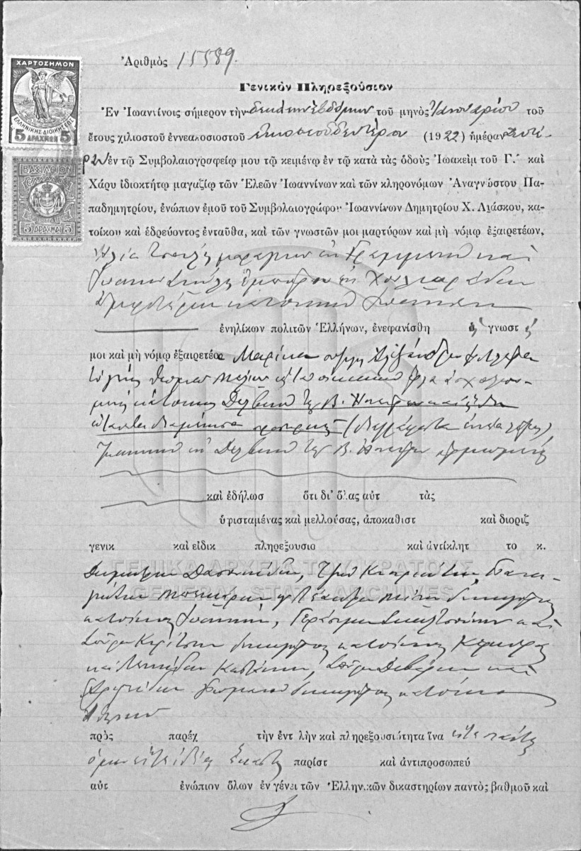 [Τεκμήριο] GRGSA-IAE_NOT002.01.F000037.IT015589 Τεκμήριο #15589 [17 Ιανουαρίου 1922] Συμβολαιογραφική πράξη. Γενικό πληρεξούσιο. |