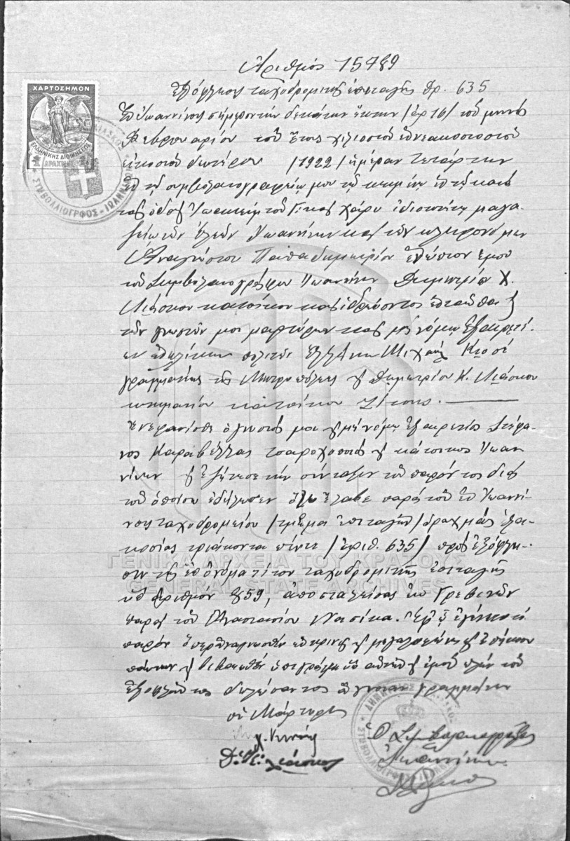 [Item] GRGSA-IAE_NOT002.01.F000037.IT015789 Item #15789 [16 Φεβρουαρίου 1922] Notarial deed. Postal cheque payment deed. |