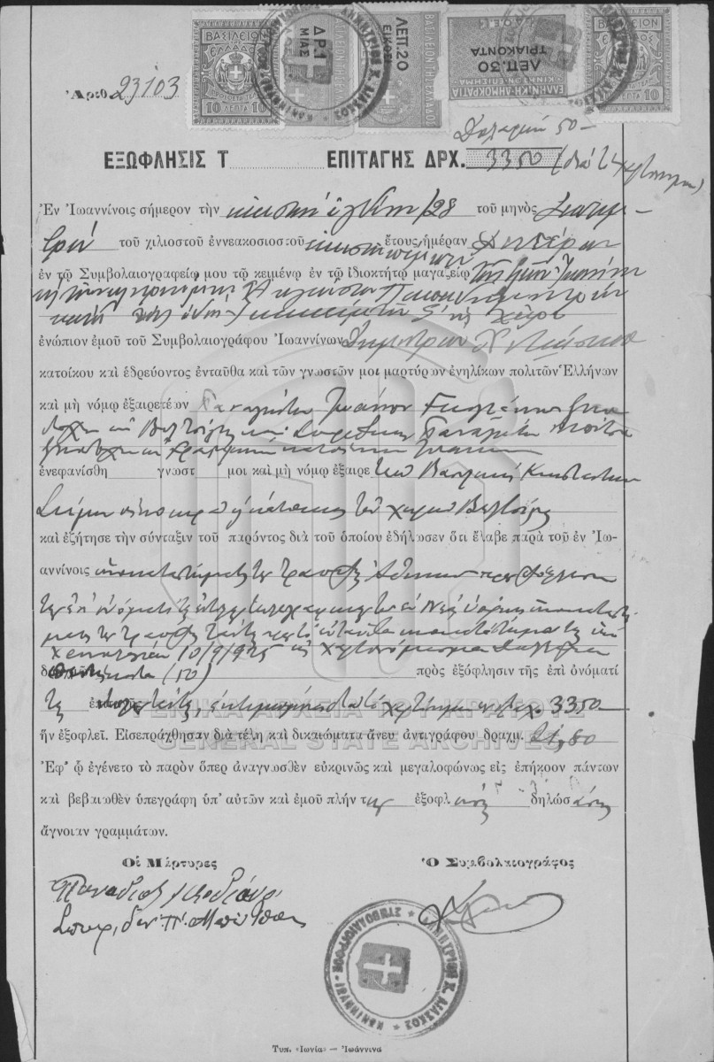 [Τεκμήριο] GRGSA-IAE_NOT002.01.F000059.IT023103 Τεκμήριο #23103 [28 Σεπτεμβρίου 1925] Συμβολαιογραφική πράξη. Εξόφληση επιταγής. |