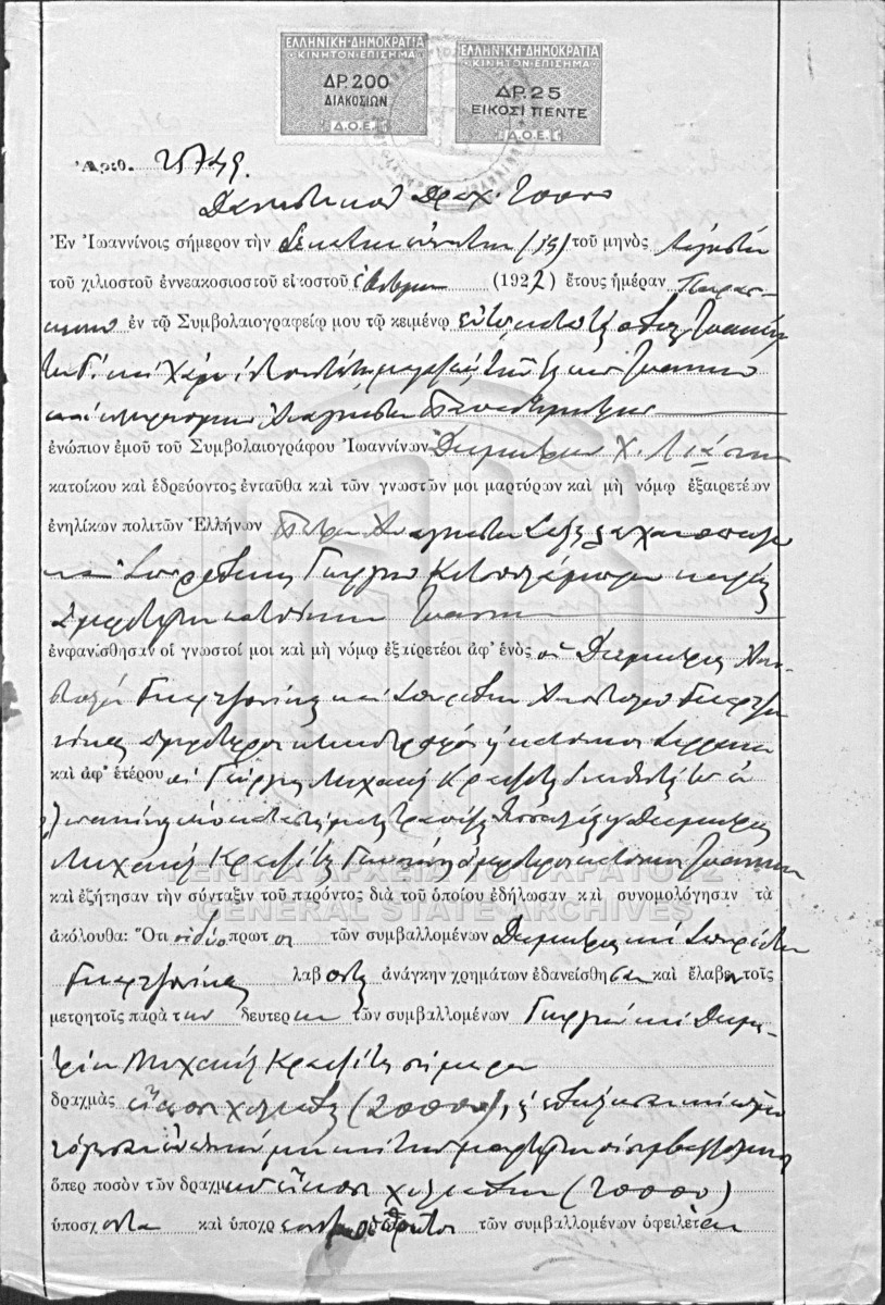 [Pièce] GRGSA-IAE_NOT002.01.F000066.IT025749 Pièce #25749 [19 Αυγούστου 1927] Συμβολαιογραφική πράξη. Δανειστικό. |