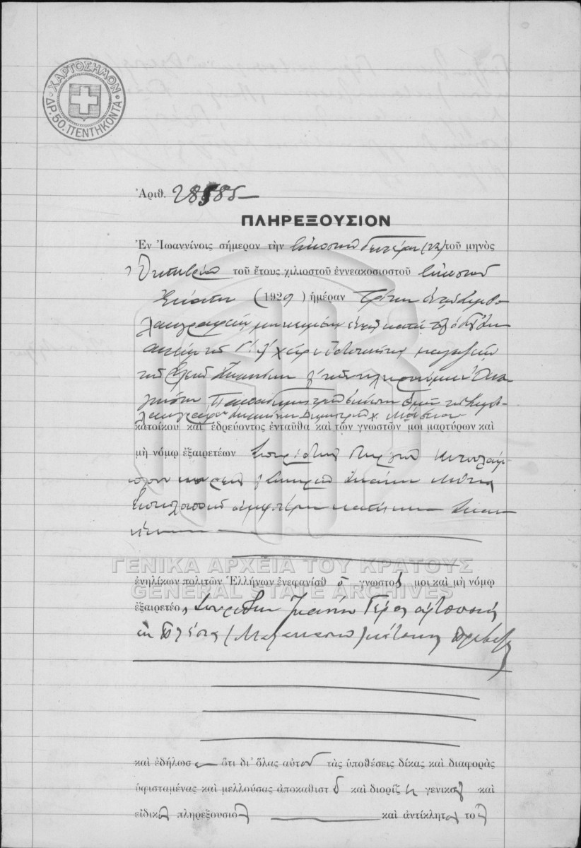 [Pièce] GRGSA-IAE_NOT002.01.F000077.IT028585 Pièce #28585 [22 Οκτωβρίου 1929] Συμβολαιογραφική πράξη. Πληρεξούσιο. |