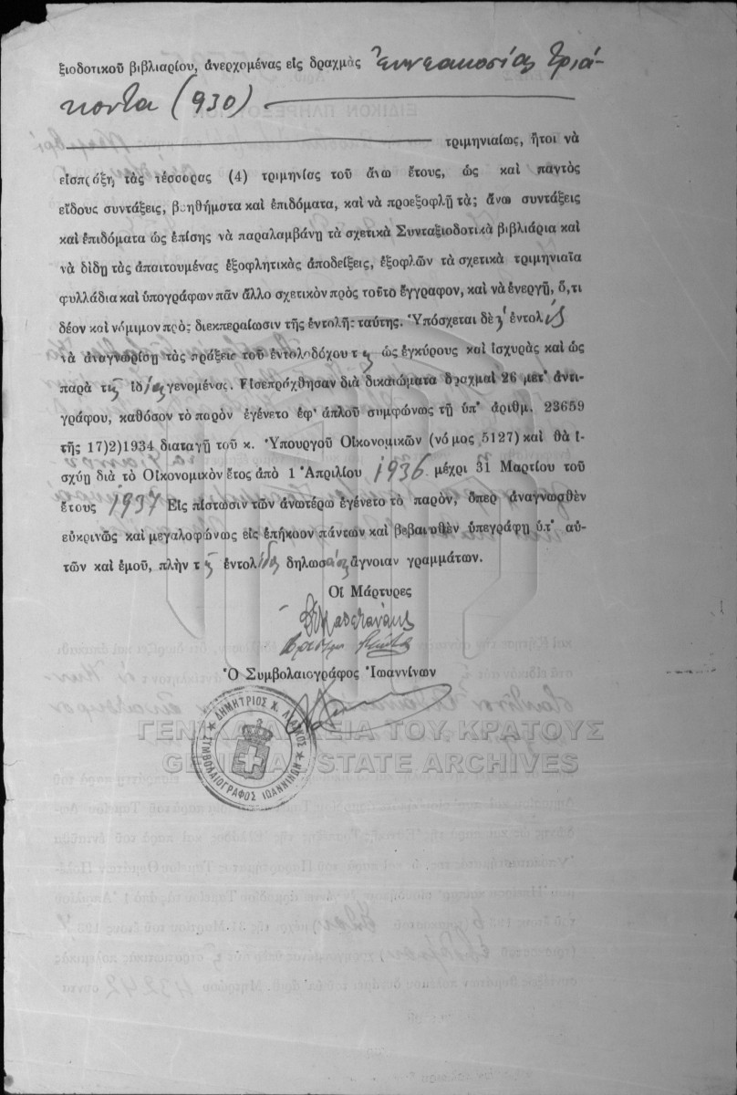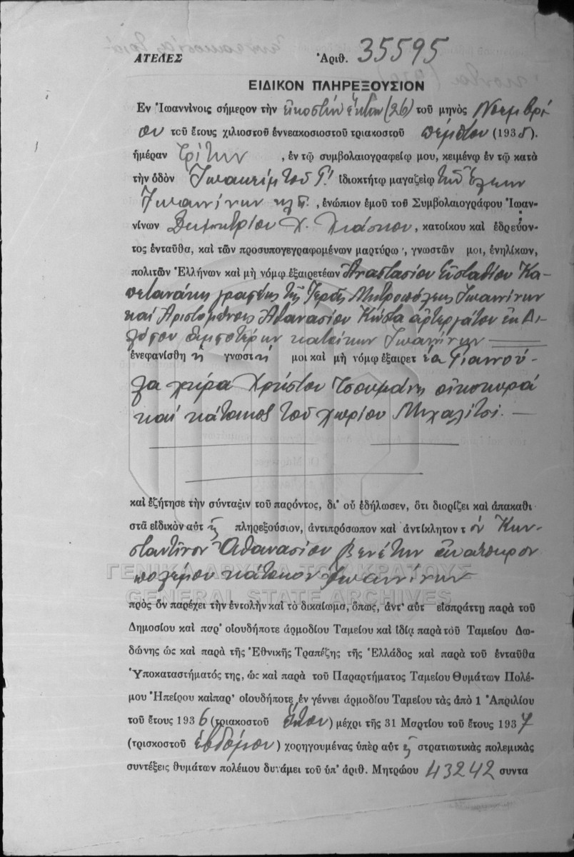 [Τεκμήριο] GRGSA-IAE_NOT002.01.F000104.IT035595 Τεκμήριο #35595 [26 Νοεμβρίου 1935] Συμβολαιογραφική πράξη. Ειδικό πληρεξούσιο. |