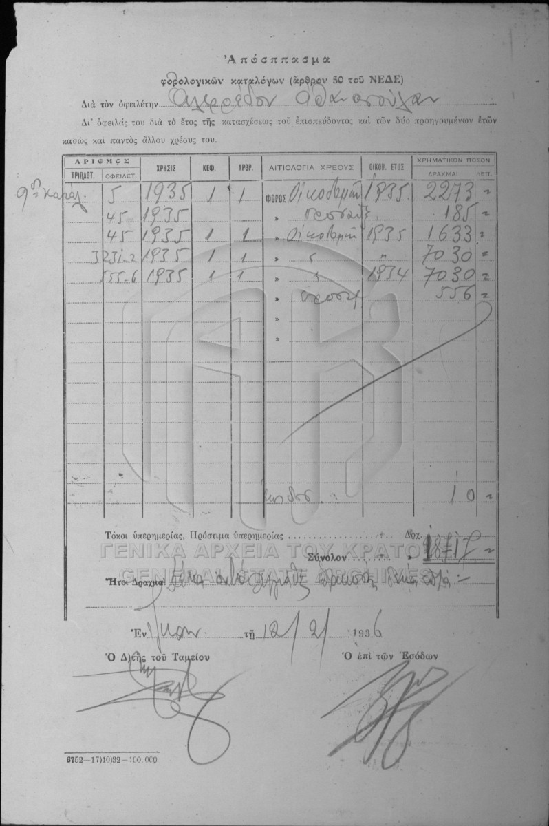 [Pièce] GRGSA-IAE_NOT002.01.F000105.IT035845 Pièce #35845 [12 Φεβρουαρίου 1936] Συμβολαιογραφική πράξη. Κατάθεση εγγράφου. |