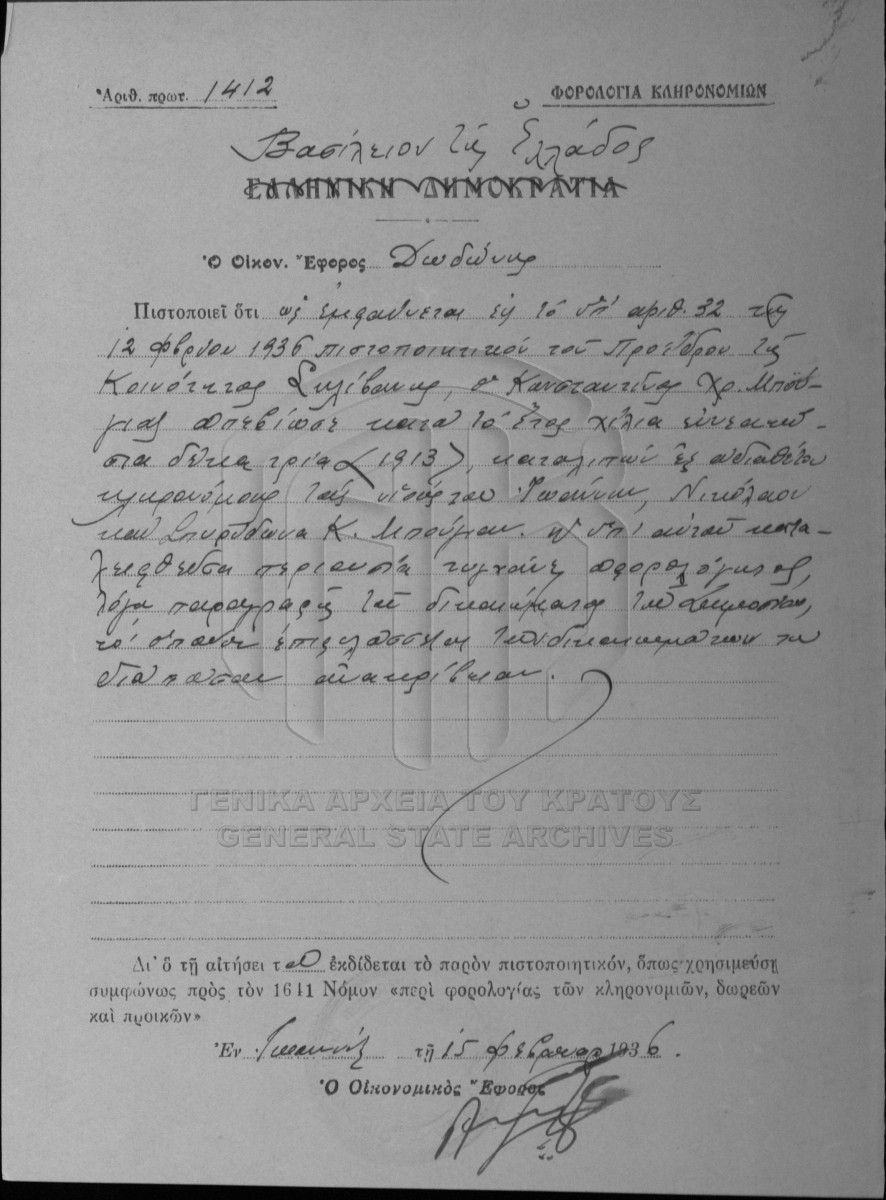 [Pièce] GRGSA-IAE_NOT002.01.F000105.IT035851 Pièce #35851 [13 Φεβρουαρίου 1936] Συμβολαιογραφική πράξη. Αγοραπωλησία ακινήτου. |