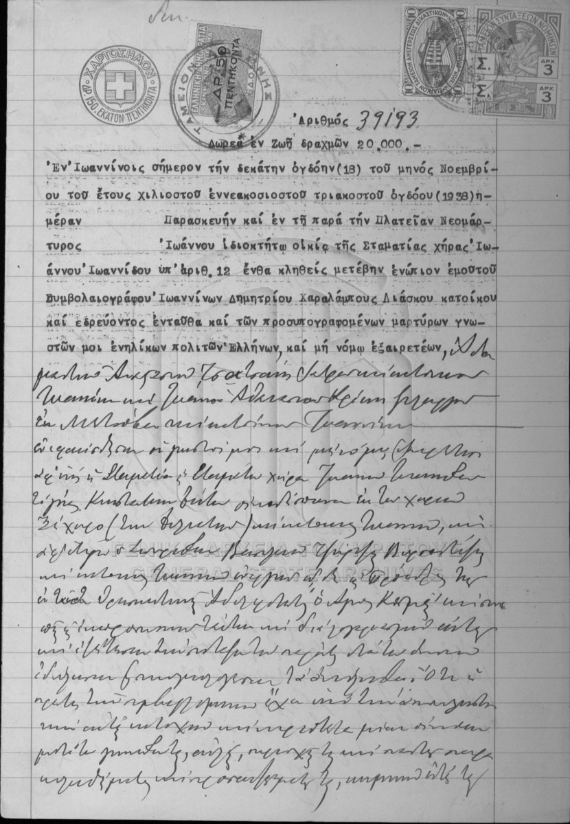 [Pièce] GRGSA-IAE_NOT002.01.F000116.IT039193 Pièce #39193 [18 Νοεμβρίου 1938] Συμβολαιογραφική πράξη. Δωρεά εν ζωή. |
