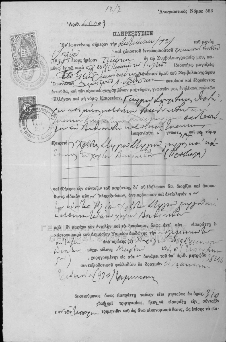 [Pièce] GRGSA-IAE_NOT002.01.F000119.IT040009 Pièce #40009 [12 Ιουλίου 1939] Συμβολαιογραφική πράξη. Πληρεξούσιο. |