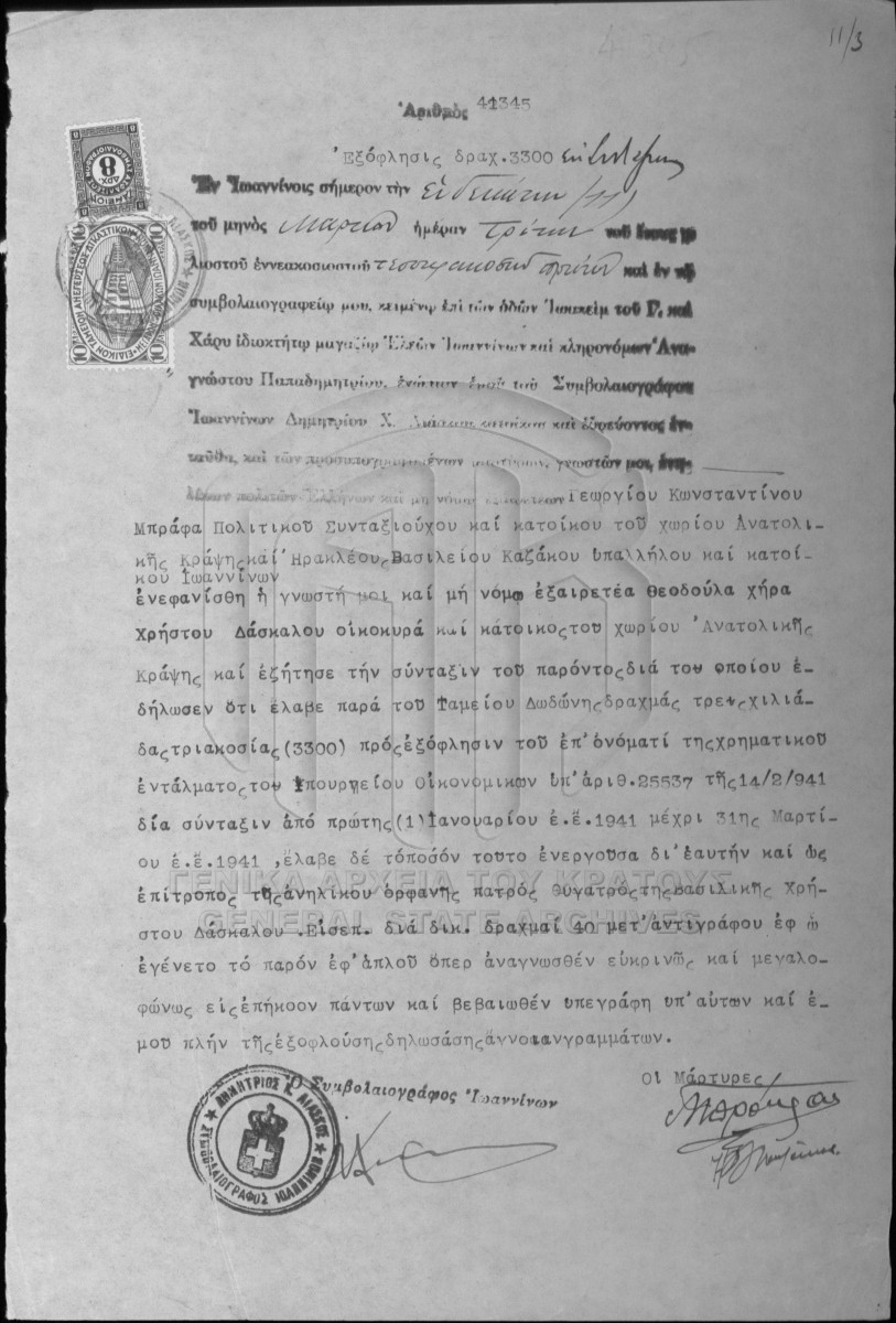 [Τεκμήριο] GRGSA-IAE_NOT002.01.F000122.IT041345 Τεκμήριο #41345 [11 Μαρτίου 1941] Συμβολαιογραφική πράξη. Εξόφληση εκ συντάξεως. |