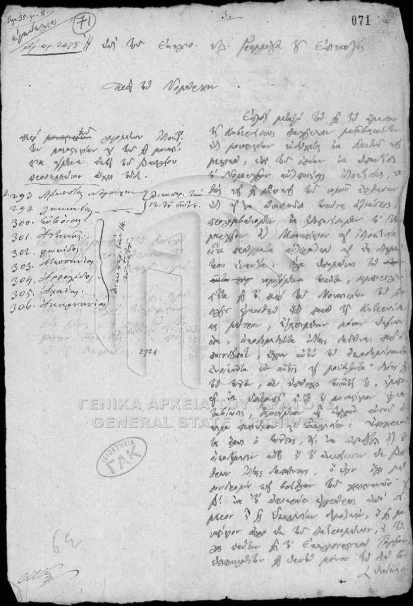 Περιέχει γενικά μοναστηριακά έγγραφα περί των Μοναστηριών του Κράτους, διατάξεις και έγγραφα που αφορούν όλες εν γένει τις Μονές και μονα...