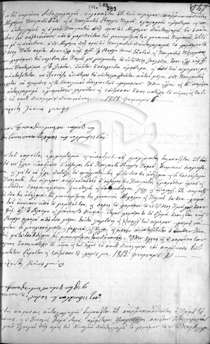 [File] GRGSA-CHI_NOT039.00.F001100 File #1100 [1859-1868] Περιεχει ανταλλαγές, αγοραπωλησίες, διαθήκες, εξοφλήσεις, ψυχικά, προικοσύμφωνα, μοιραστήρια και αφιερώματα. |