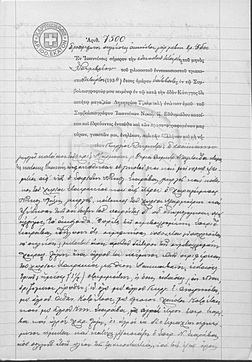 [Pièce] GRGSA-IAE_NOT004.01.F000024.IT007500 Pièce #7500 [24 Νοεμβρίου 1934] Συμβολαιογραφική πράξη. Προσύμφωνο πωλήσεως ακινήτου και αρραβώνας. |