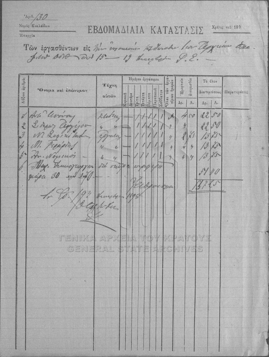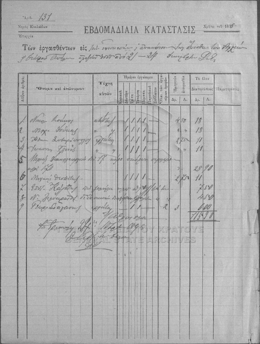 [Fichier] GRGSA-CYC_MUN001.01.F000197 Fichier #197 [1898] ΔΗΜΟΤΙΚΑ ΕΡΓΑ 143: Αναλυτικές καταστάσεις εκτελεσθέντων με ημερομίσθια δημοτ. έργων - πληρωμές εργατών και προμηθευτών. |
