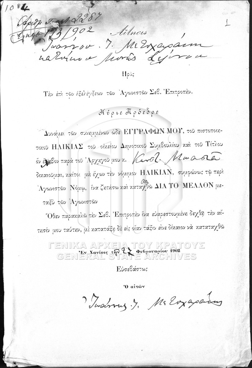 [Sous-fichier] GRGSA-IAK_AGO012.01.F000008.SF1748 Sous-fichier #1748 [1902] Αιτήσεις - πιστοποιητικά αγωνιστών, χηρών - ορφανών του Νομού Χανίων προς την Επιτροπή αγωνιστών. |