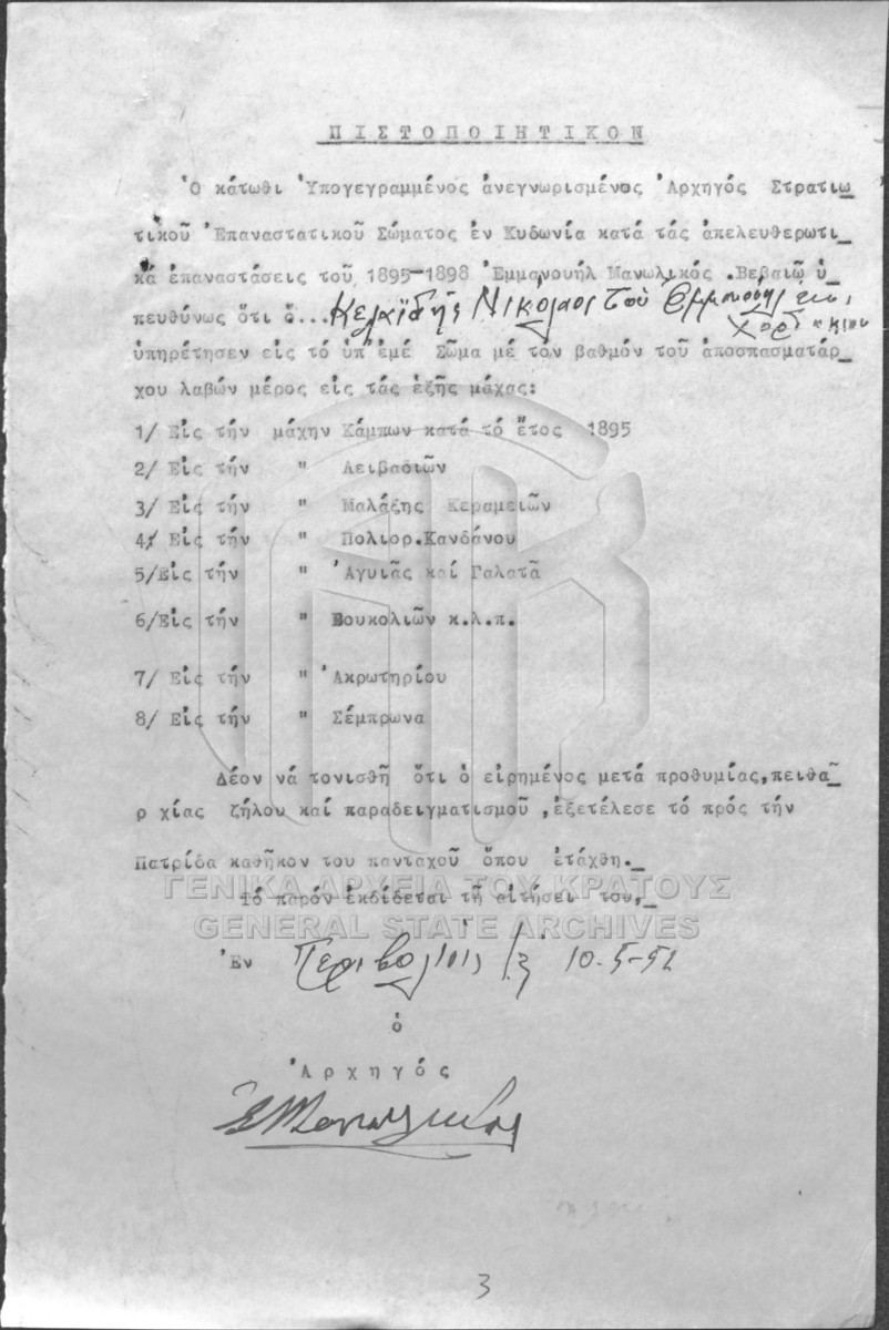 Αιτήσεις - πιστοποιητικά αγωνιστών, χηρών - ορφανών προς την Επιτροπή αγωνιστών.