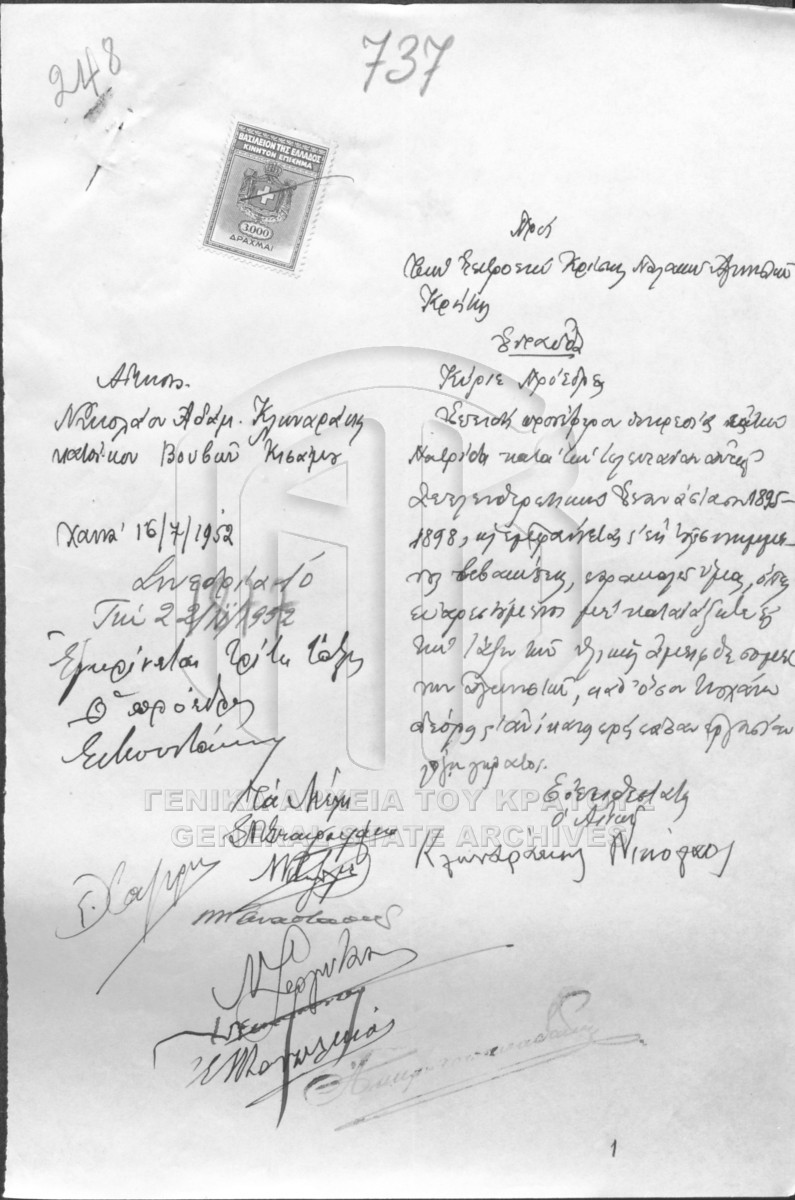 [Τεκμήριο] GRGSA-IAK_AGO012.01.F000080.SF0002.IT00737 Τεκμήριο #737 [1952] Αιτήσεις - πιστοποιητικά αγωνιστών, χηρών - ορφανών προς την Επιτροπή αγωνιστών. |