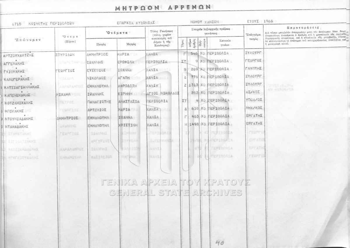 Μητρώο Αρρένων της Κοινότητος Περιβολίων του Νομού Χανίων. Περιέχονται οι γεννηθέντες κατά τα έτη 1938 - 1967.