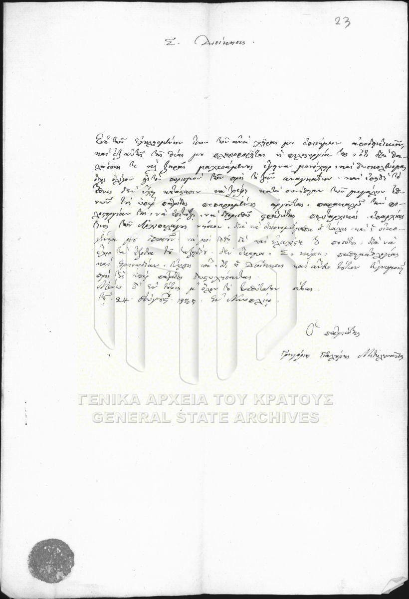 Περιέχει επιστολές, καταλόγους (ονομάτων, μισθοδοσίας), υπηρεσιακές επιστολές, λογαριασμούς και διάφορα έγγραφα.