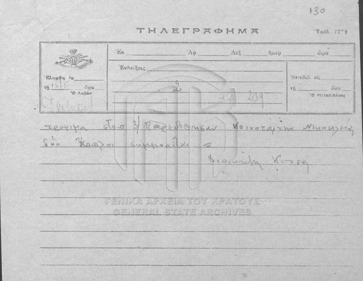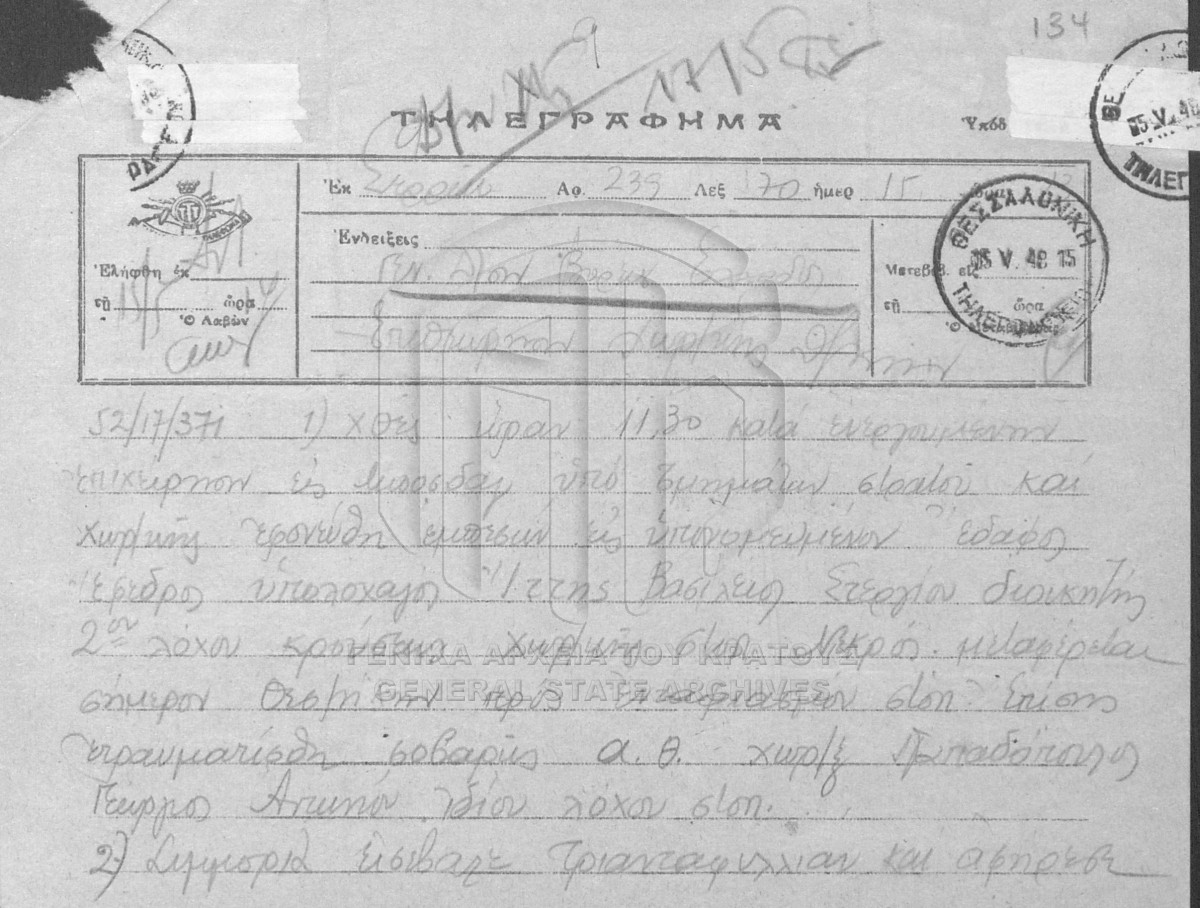 [Item] GRGSA-IAM_ADM002.01.FB00024.SF000005.IT000002 Item #002 - ΓΕΝΙΚΗ ΔΙΟΙΚΗΣΗ ΒΟΡΕΙΟΥ ΕΛΛΑΔΟΣ. Β/24: ΑΝΑΦΟΡΕΣ ΑΣΤΥΝΟΜΙΑΣ [1949] Τηλεγραφήματα και δελτία αδικημάτων και συμβάντων των διοικήσεων Χωρ/κής Αλεξ/πολης, Βέροιας, Γρεβενών, Δράμας, Καστοριάς, Θεσ/νίκης Καβά... |