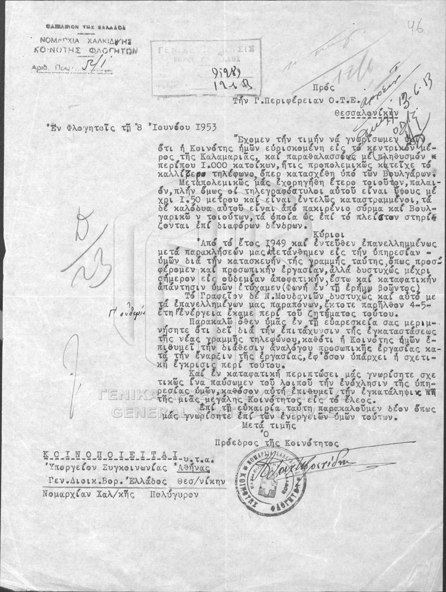 [Τεκμήριο] GRGSA-IAM_ADM002.01.FD00023.SF000005.IT000003 Τεκμήριο #003 - ΓΕΝΙΚΗ ΔΙΟΙΚΗΣΗ ΒΟΡΕΙΟΥ ΕΛΛΑΔΟΣ. Δ/23: ΤΑΧΥΔΡΟΜΕΙΑ. ΑΝΑΠΤΥΞΗ ΜΕΣΩΝ ΕΠΙΚΟΙΝΩΝΙΑΣ. ΔΡΟΜΟΛΟΓΙΑ ΔΙΑΝΟΜΕΩΝ Κ.Λ.Π. [1953] Τηλεφωνική υπηρεσία. |