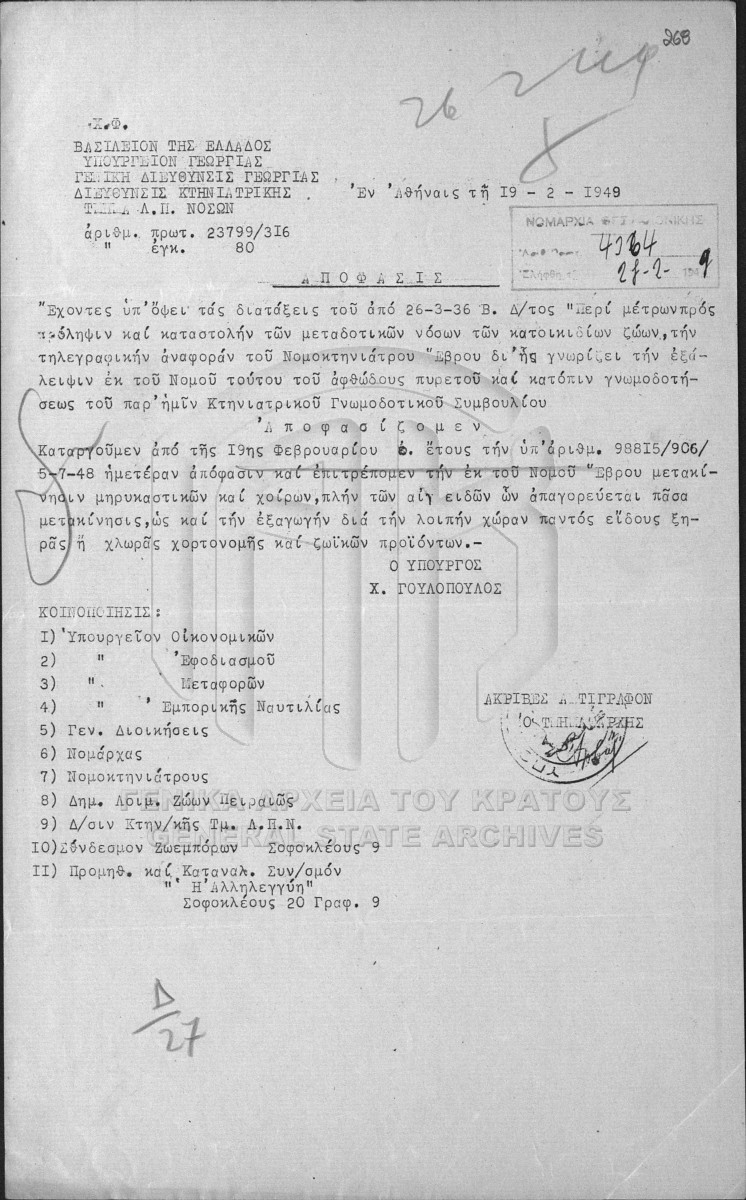 Pièce #005 - ΓΕΝΙΚΗ ΔΙΟΙΚΗΣΗ ΒΟΡΕΙΟΥ ΕΛΛΑΔΟΣ. Δ/27: ΚΤΗΝΟΤΡΟΦΙΑ ΚΑΙ ΖΩΟΤΕΧΝΙΑ. ΔΑΣΗ. ΘΗΡΑ  [1949]