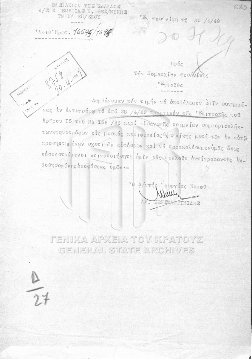 Fichier #D00027 - ΓΕΝΙΚΗ ΔΙΟΙΚΗΣΗ ΒΟΡΕΙΟΥ ΕΛΛΑΔΟΣ. Δ/27: ΚΤΗΝΟΤΡΟΦΙΑ ΚΑΙ ΖΩΟΤΕΧΝΙΑ. ΔΑΣΗ. ΘΗΡΑ  [1945 - 1949]