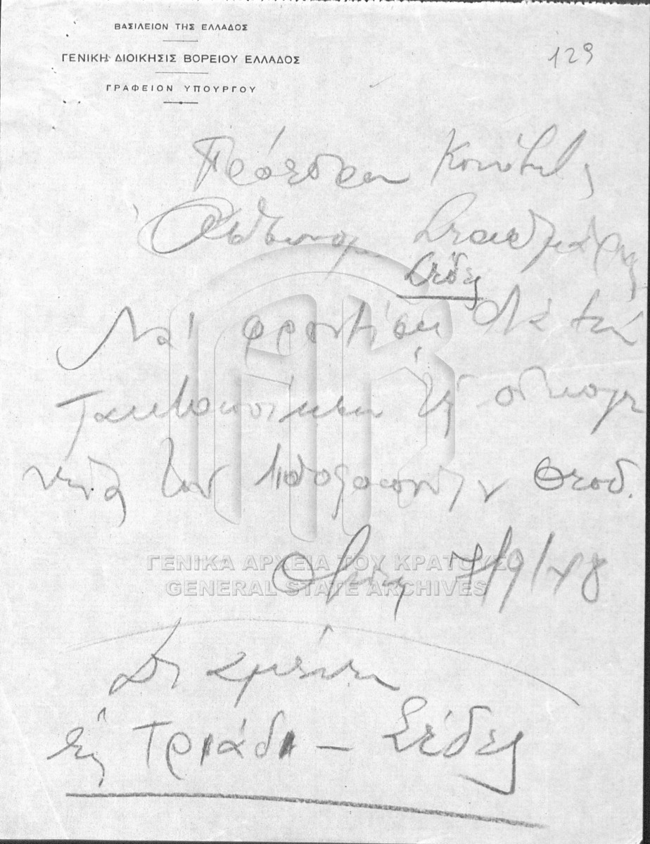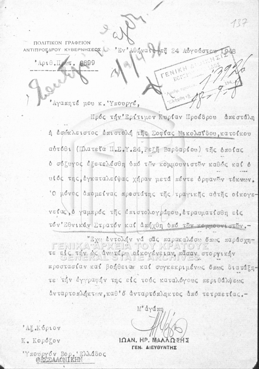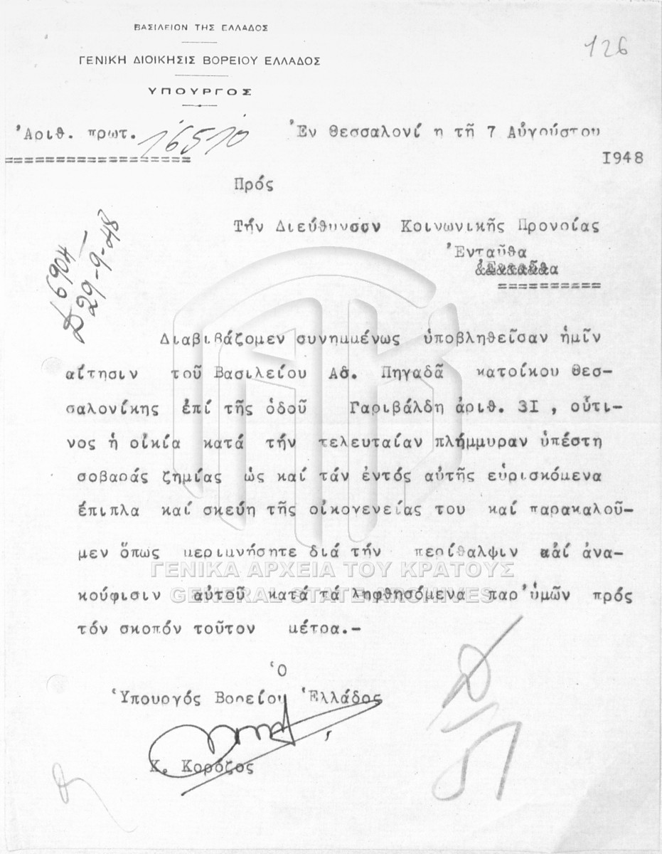 Item #003 - ΓΕΝΙΚΗ ΔΙΟΙΚΗΣΗ ΒΟΡΕΙΟΥ ΕΛΛΑΔΟΣ. Δ/51: ΠΕΡΙΘΑΛΨΗ ΣΕΙΣΜΟΠΑΘΩΝ, ΠΛΗΜΜΥΡΟΠΑΘΩΝ ΚΑΙ ΑΝΑΞΙΟΠΑΘΟΥΝΤΩΝ ΕΝ ΓΕΝΕΙ  [1948]