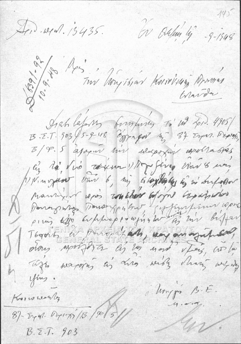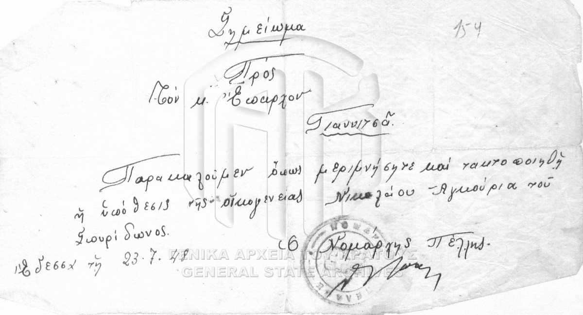 Item #003 - ΓΕΝΙΚΗ ΔΙΟΙΚΗΣΗ ΒΟΡΕΙΟΥ ΕΛΛΑΔΟΣ. Δ/51: ΠΕΡΙΘΑΛΨΗ ΣΕΙΣΜΟΠΑΘΩΝ, ΠΛΗΜΜΥΡΟΠΑΘΩΝ ΚΑΙ ΑΝΑΞΙΟΠΑΘΟΥΝΤΩΝ ΕΝ ΓΕΝΕΙ  [1948]