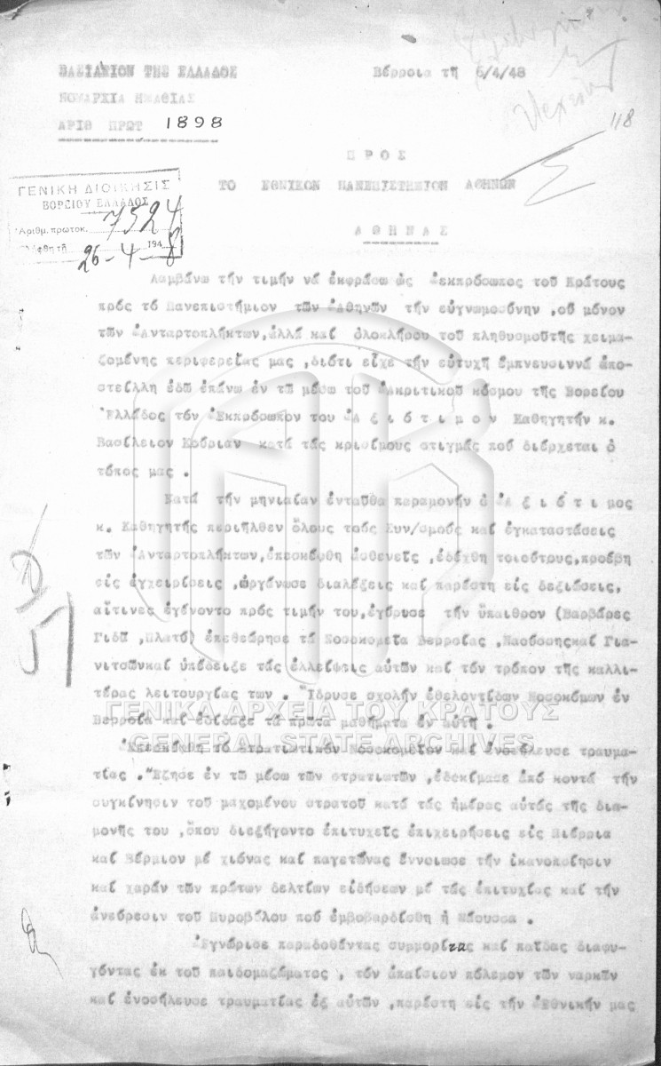 Item #004 - ΓΕΝΙΚΗ ΔΙΟΙΚΗΣΗ ΒΟΡΕΙΟΥ ΕΛΛΑΔΟΣ. Δ/51: ΠΕΡΙΘΑΛΨΗ ΣΕΙΣΜΟΠΑΘΩΝ, ΠΛΗΜΜΥΡΟΠΑΘΩΝ ΚΑΙ ΑΝΑΞΙΟΠΑΘΟΥΝΤΩΝ ΕΝ ΓΕΝΕΙ  [1947-1948]