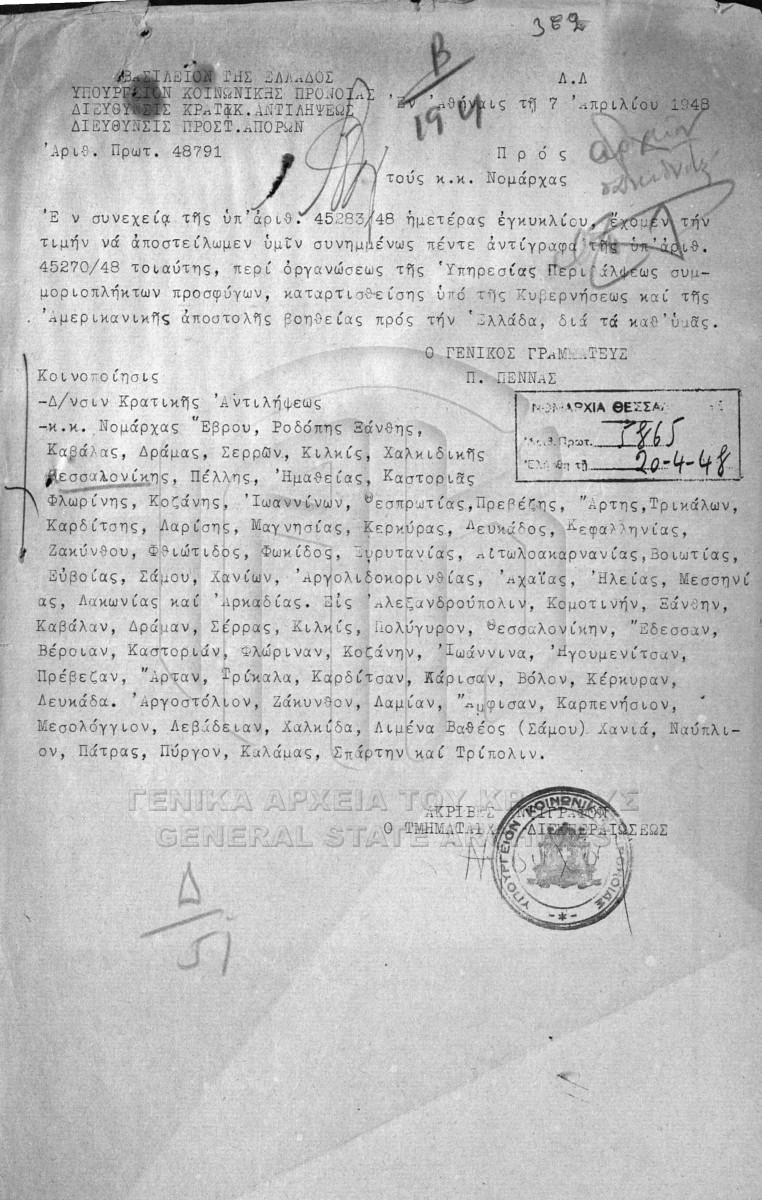 Item #001 - ΓΕΝΙΚΗ ΔΙΟΙΚΗΣΗ ΒΟΡΕΙΟΥ ΕΛΛΑΔΟΣ. Δ/51: ΠΕΡΙΘΑΛΨΗ ΣΕΙΣΜΟΠΑΘΩΝ, ΠΛΗΜΜΥΡΟΠΑΘΩΝ ΚΑΙ ΑΝΑΞΙΟΠΑΘΟΥΝΤΩΝ ΕΝ ΓΕΝΕΙ  [1948]