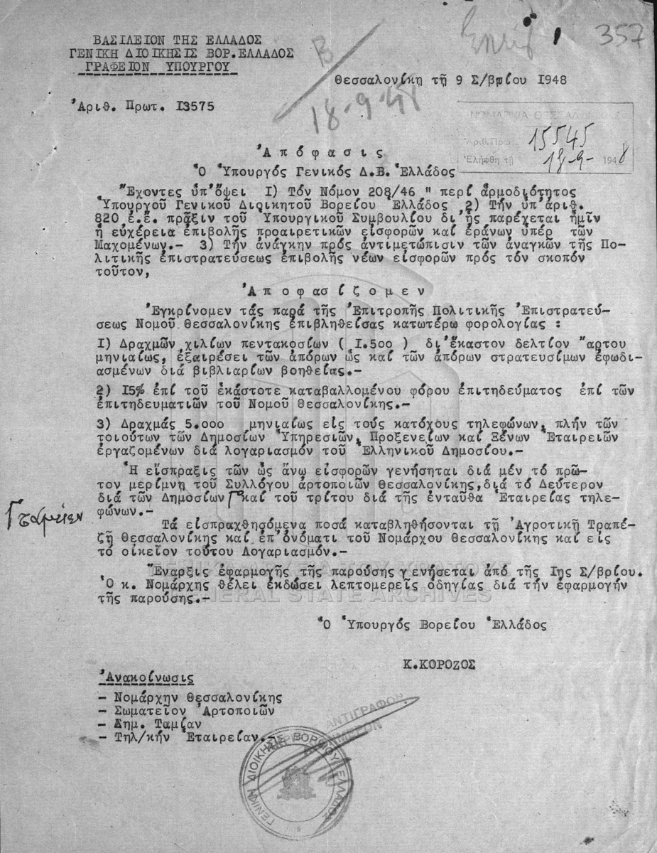 Σύσταση επιτροπών πολιτικής επιστράτευσης, πρακτικά, πίνακες απαχθεισών νεανίδων, προστασία οικογενειών, εισφορές.