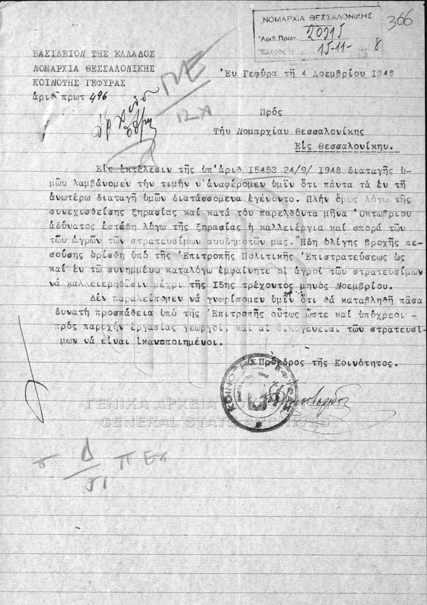 Σύσταση επιτροπών πολιτικής επιστράτευσης, πρακτικά, πίνακες απαχθεισών νεανίδων, προστασία οικογενειών, εισφορές.