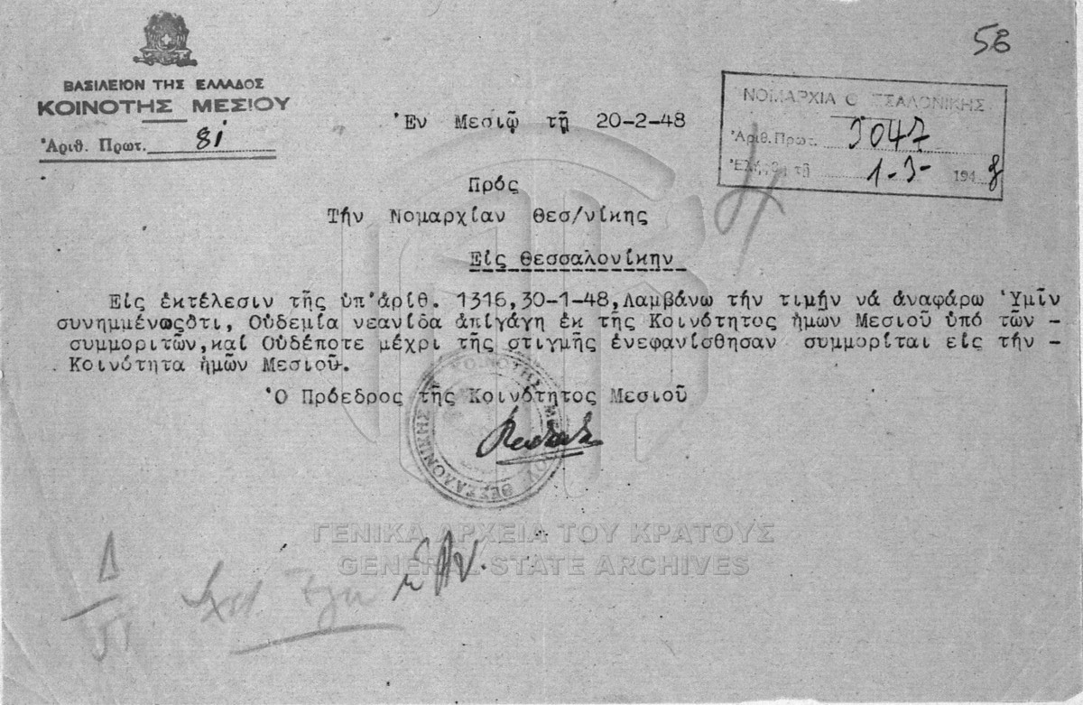 Σύσταση επιτροπών πολιτικής επιστράτευσης, πρακτικά, πίνακες απαχθεισών νεανίδων, προστασία οικογενειών, εισφορές.