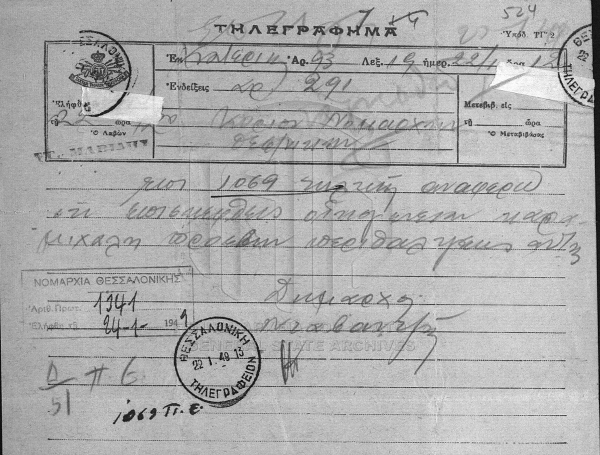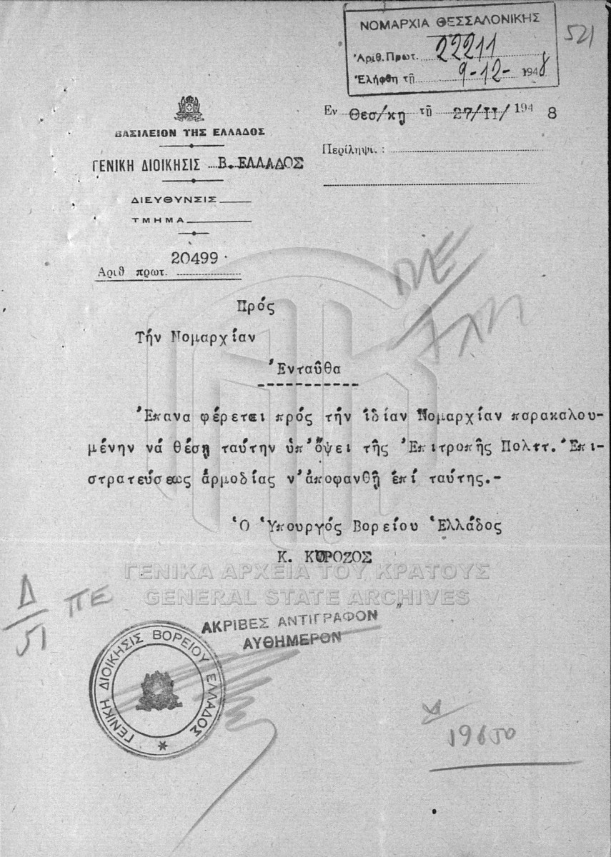 Item #001 - ΓΕΝΙΚΗ ΔΙΟΙΚΗΣΗ ΒΟΡΕΙΟΥ ΕΛΛΑΔΟΣ. Δ/51: ΠΕΡΙΘΑΛΨΗ ΣΕΙΣΜΟΠΑΘΩΝ, ΠΛΗΜΜΥΡΟΠΑΘΩΝ ΚΑΙ ΑΝΑΞΙΟΠΑΘΟΥΝΤΩΝ ΕΝ ΓΕΝΕΙ  [1948-1949]