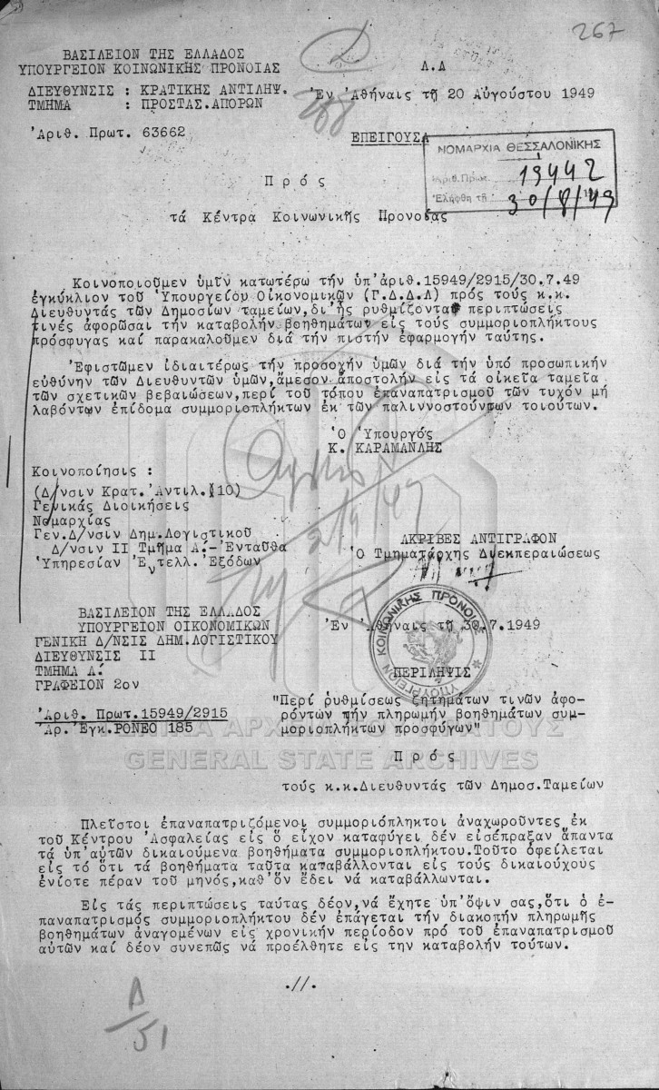 Pièce #001 - ΓΕΝΙΚΗ ΔΙΟΙΚΗΣΗ ΒΟΡΕΙΟΥ ΕΛΛΑΔΟΣ. Δ/51: ΠΕΡΙΘΑΛΨΗ ΣΕΙΣΜΟΠΑΘΩΝ, ΠΛΗΜΜΥΡΟΠΑΘΩΝ ΚΑΙ ΑΝΑΞΙΟΠΑΘΟΥΝΤΩΝ ΕΝ ΓΕΝΕΙ  [1948-1950]