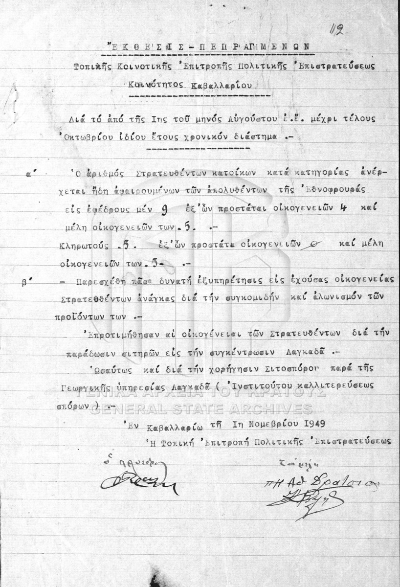 Μέριμνα για οικογένειες στρατευμένων. Εκθέσεις πεπραγμένων επιτροπών Πολιτικής προστασίας σχετικά με επιδόματα.