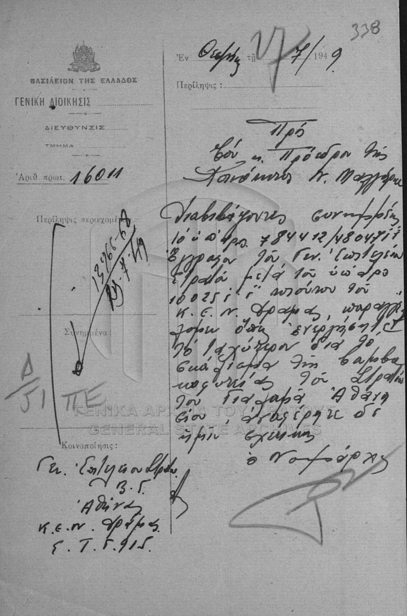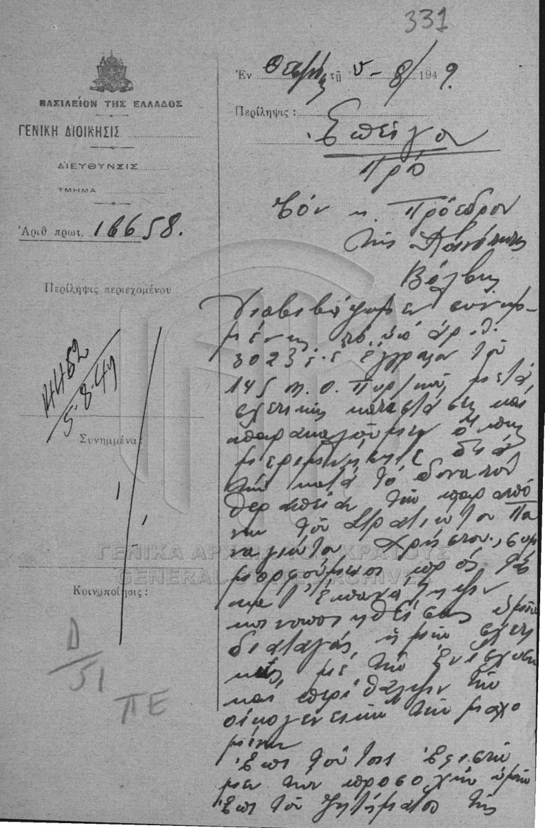 Item #001 - ΓΕΝΙΚΗ ΔΙΟΙΚΗΣΗ ΒΟΡΕΙΟΥ ΕΛΛΑΔΟΣ. Δ/51: ΠΕΡΙΘΑΛΨΗ ΣΕΙΣΜΟΠΑΘΩΝ, ΠΛΗΜΜΥΡΟΠΑΘΩΝ ΚΑΙ ΑΝΑΞΙΟΠΑΘΟΥΝΤΩΝ ΕΝ ΓΕΝΕΙ  [1948-1950]