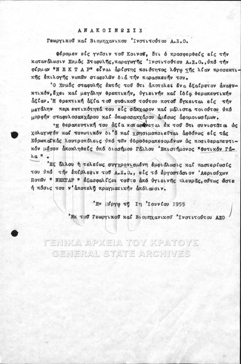 Φάκελος #011 - ΙΝΣΤΙΤΟΥΤΟ ΣΤΑΦΙΔΑΣ / ΓΕΝΙΚΟ ΑΡΧΕΙΟ  [1955 - 1960]