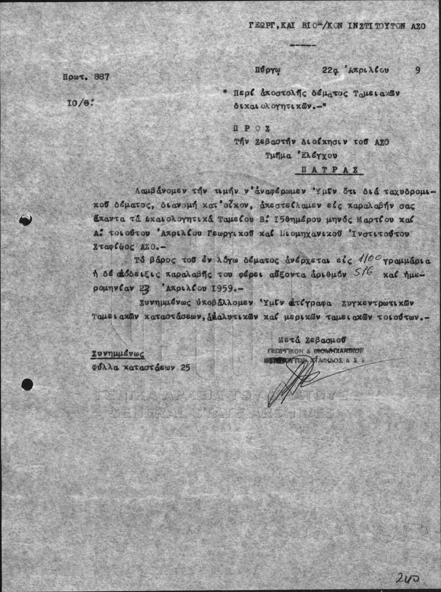 Υποφάκελος #006 - ΙΝΣΤΙΤΟΥΤΟ ΣΤΑΦΙΔΑΣ / ΓΕΝΙΚΟ ΑΡΧΕΙΟ  [1959]