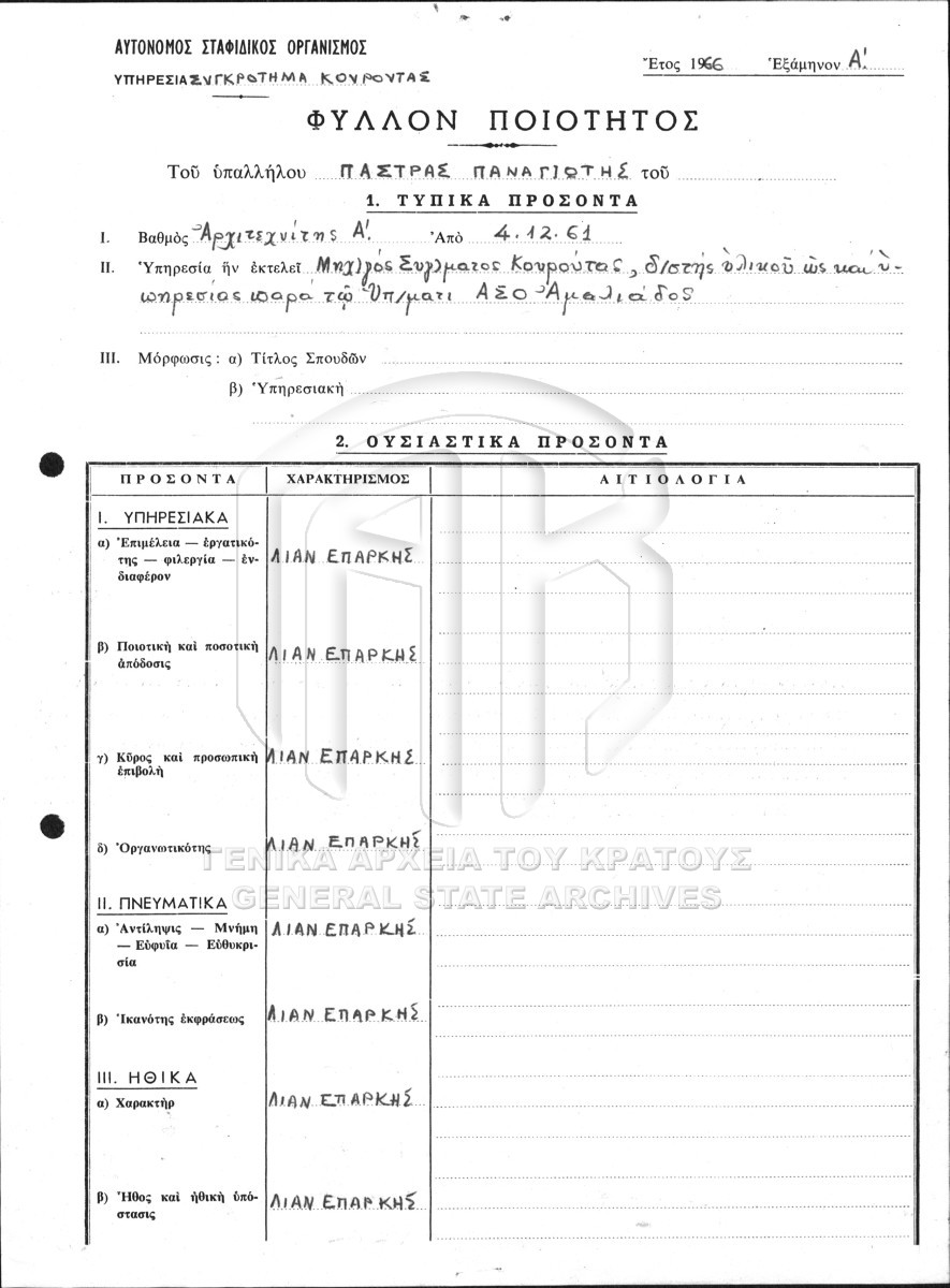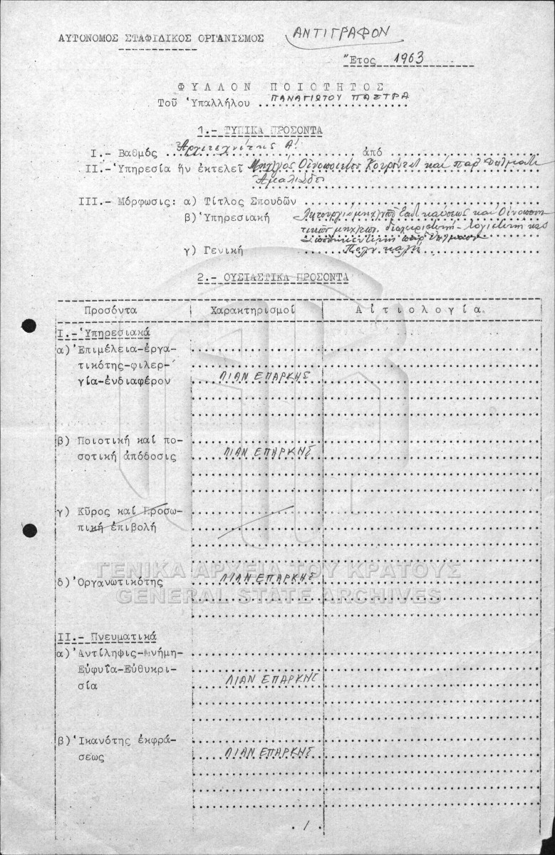 Contents: Εμπιστευτικός φάκελος. Εμπιστευτικός φάκελος εξερχομένων εγγράφων. Φύλλα ποιότητας υπαλλήλων.