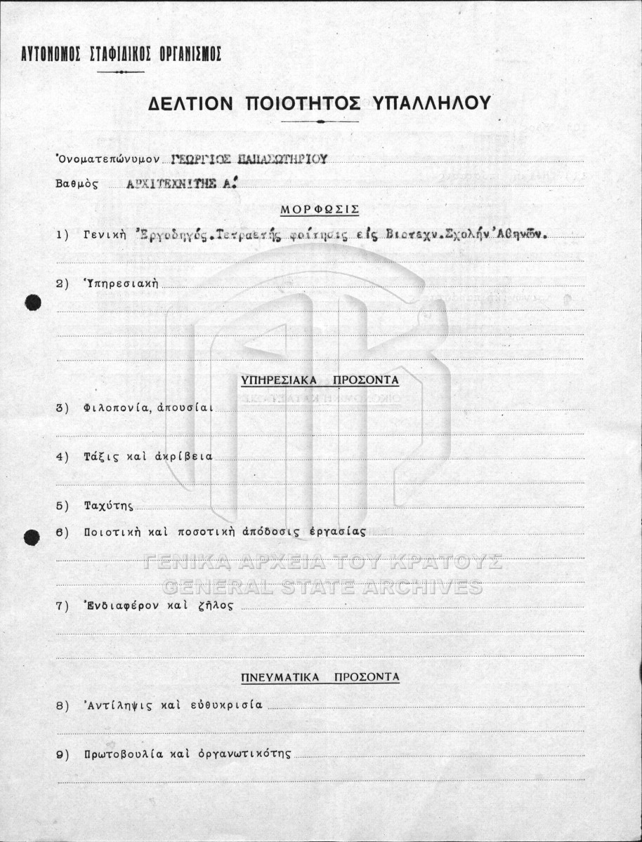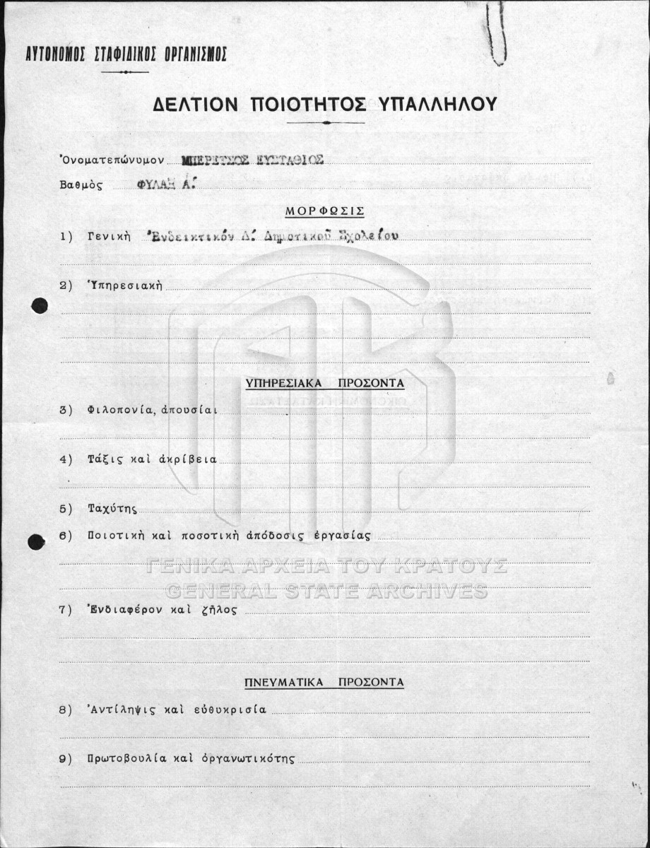 Περιεχόμενα: Εμπιστευτικός φάκελος. Εμπιστευτικός φάκελος εξερχομένων εγγράφων. Φύλλα ποιότητας υπαλλήλων.