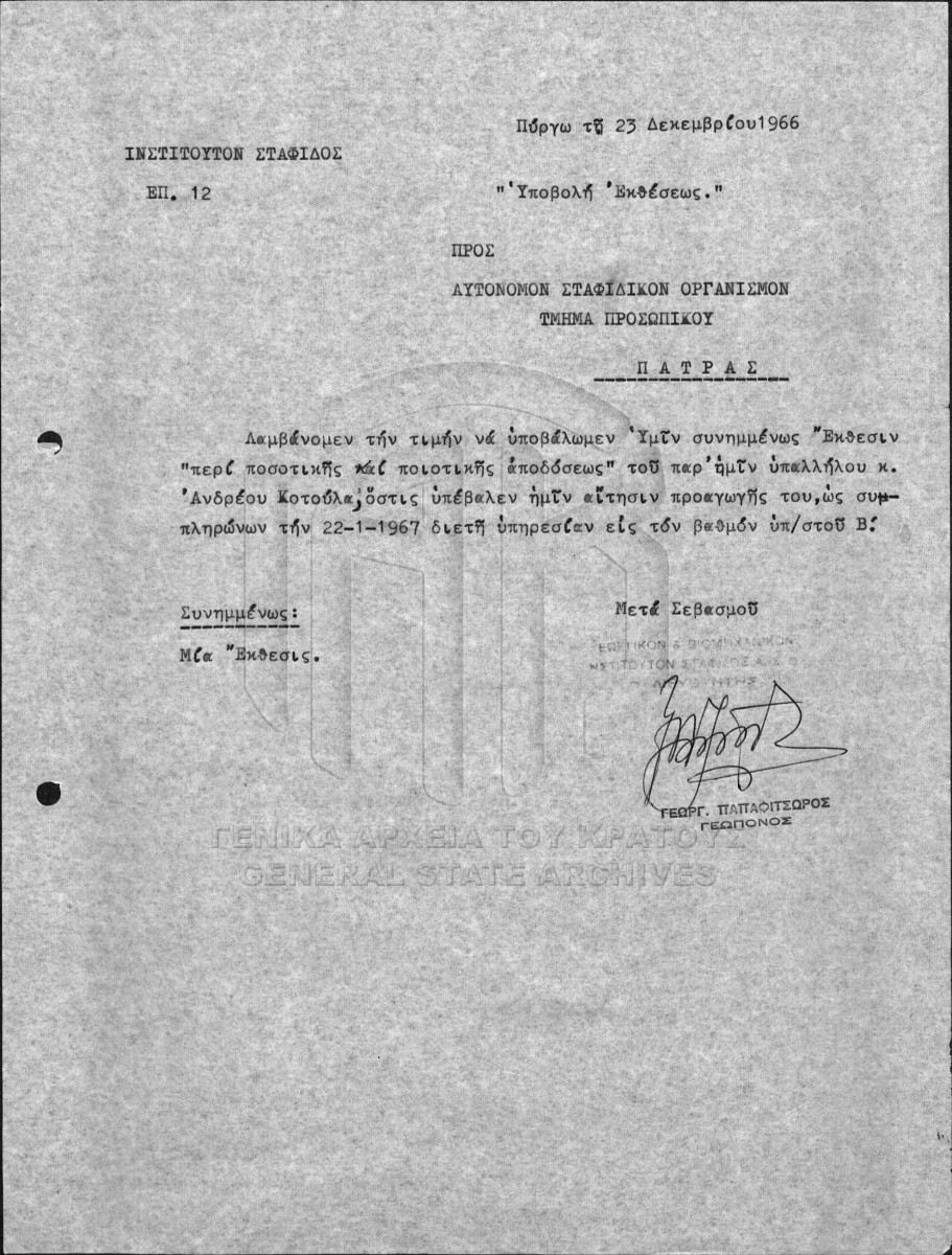 Φάκελος #012 - ΙΝΣΤΙΤΟΥΤΟ ΣΤΑΦΙΔΑΣ / ΕΜΠΙΣΤΕΥΤΙΚΟΣ ΦΑΚΕΛΟΣ  [1936 - 1985]