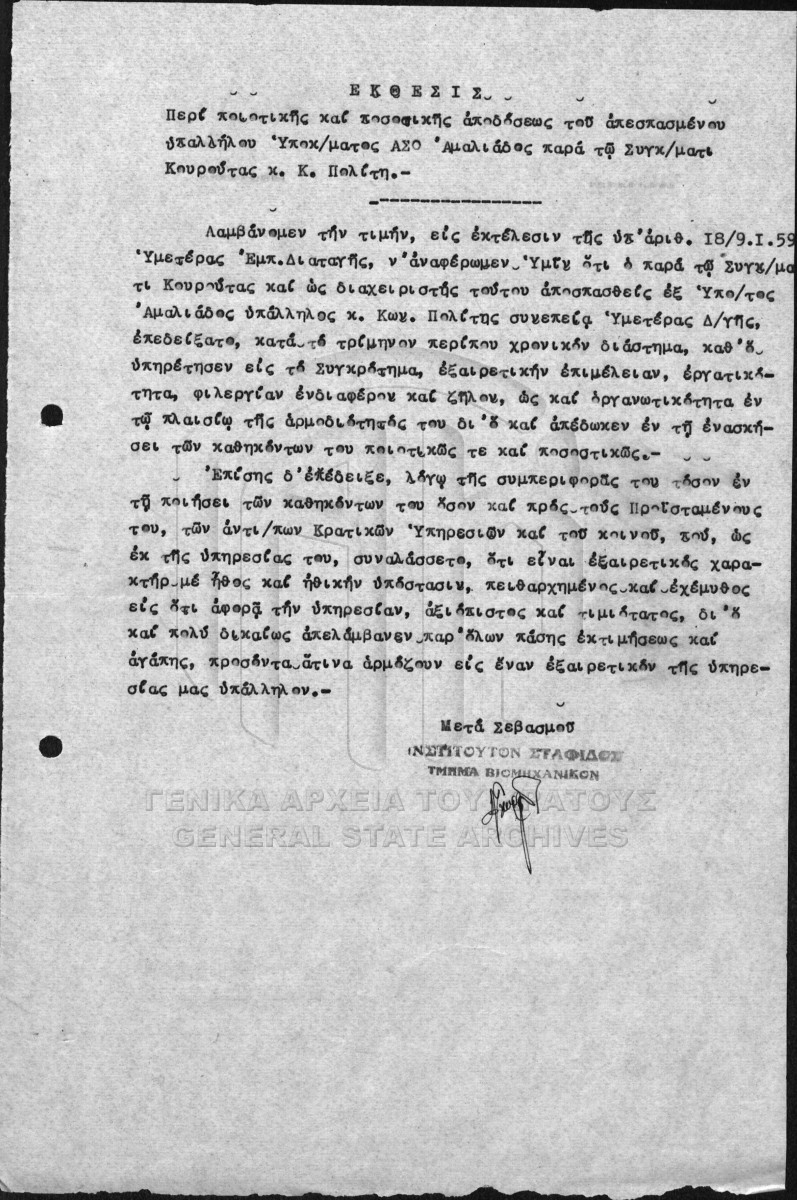 Περιεχόμενα: Εμπιστευτικός φάκελος. Εμπιστευτικός φάκελος εξερχομένων εγγράφων. Φύλλα ποιότητας υπαλλήλων.