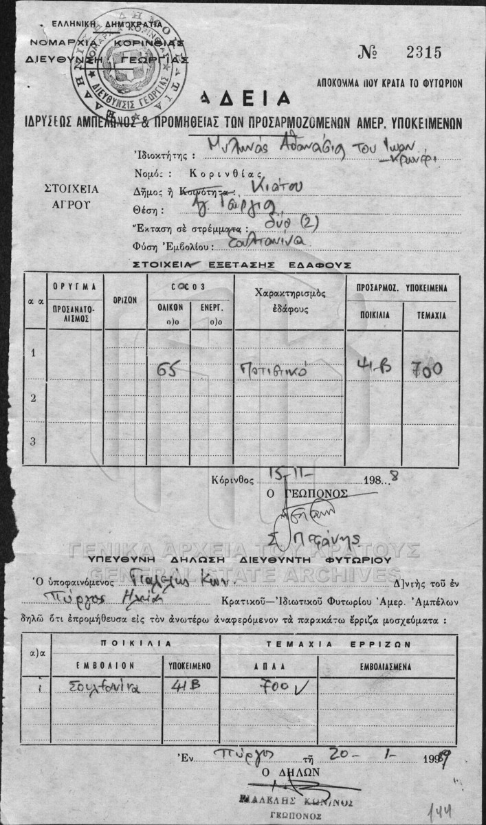 Περιεχόμενα: Αντίγραφα διαταγών κινήσεως γεωπόνων. Έρριζα. Έρριζα - άρριζα Λεβεντοχωρίου. Φυτώριο ΑΣΟ. Άδειες αναμπελώσεως. Φυτώρια. ...