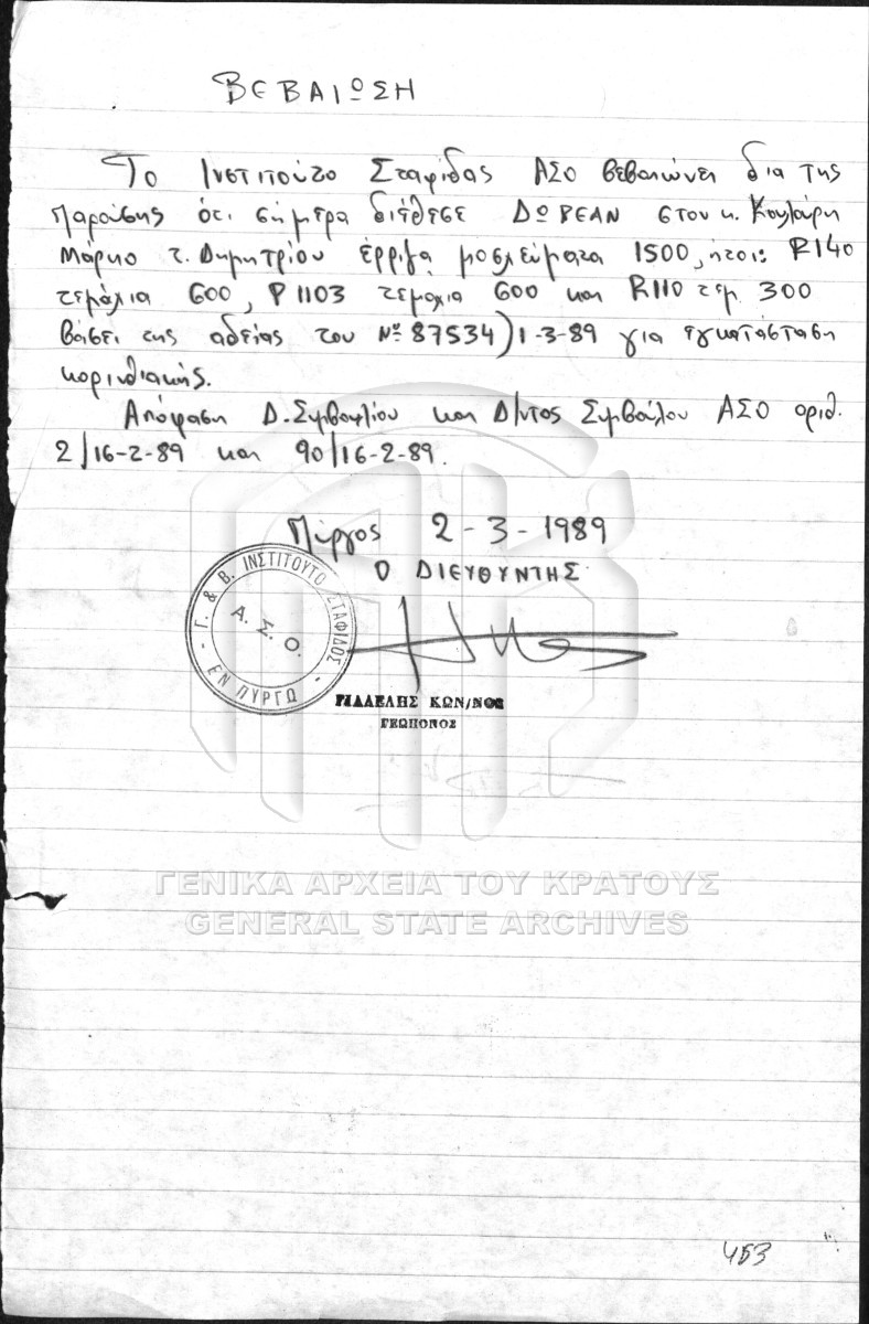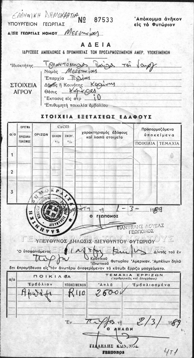 [Υποφάκελος] GRGSA-ILE_ADM007.01.F00014.SF0013 Υποφάκελος #013 - ΙΝΣΤΙΤΟΥΤΟ ΣΤΑΦΙΔΑΣ / ΑΝΑΜΠΕΛΩΣΕΙΣ, ΕΡΡΙΖΑ - ΑΡΡΙΖΑ ΜΟΣΧΕΥΜΑΤΑ [1989] Αποκόμματα αδειών. |