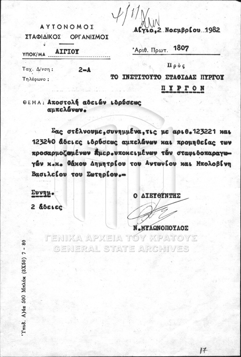 File #014 - ΙΝΣΤΙΤΟΥΤΟ ΣΤΑΦΙΔΑΣ / ΑΝΑΜΠΕΛΩΣΕΙΣ, ΕΡΡΙΖΑ - ΑΡΡΙΖΑ ΜΟΣΧΕΥΜΑΤΑ  [1960 - 1991]