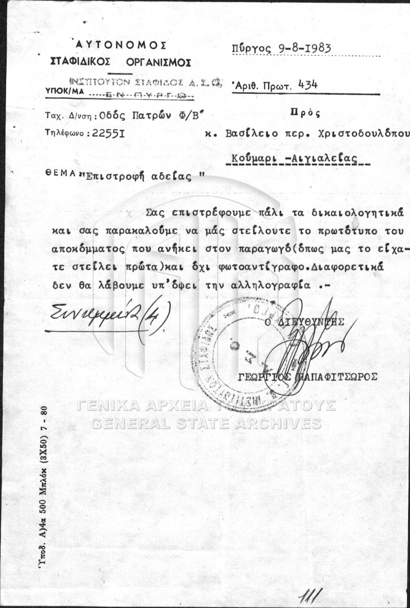 Subfile #015 - ΙΝΣΤΙΤΟΥΤΟ ΣΤΑΦΙΔΑΣ / ΑΝΑΜΠΕΛΩΣΕΙΣ, ΕΡΡΙΖΑ - ΑΡΡΙΖΑ ΜΟΣΧΕΥΜΑΤΑ  [1983 - 1984]