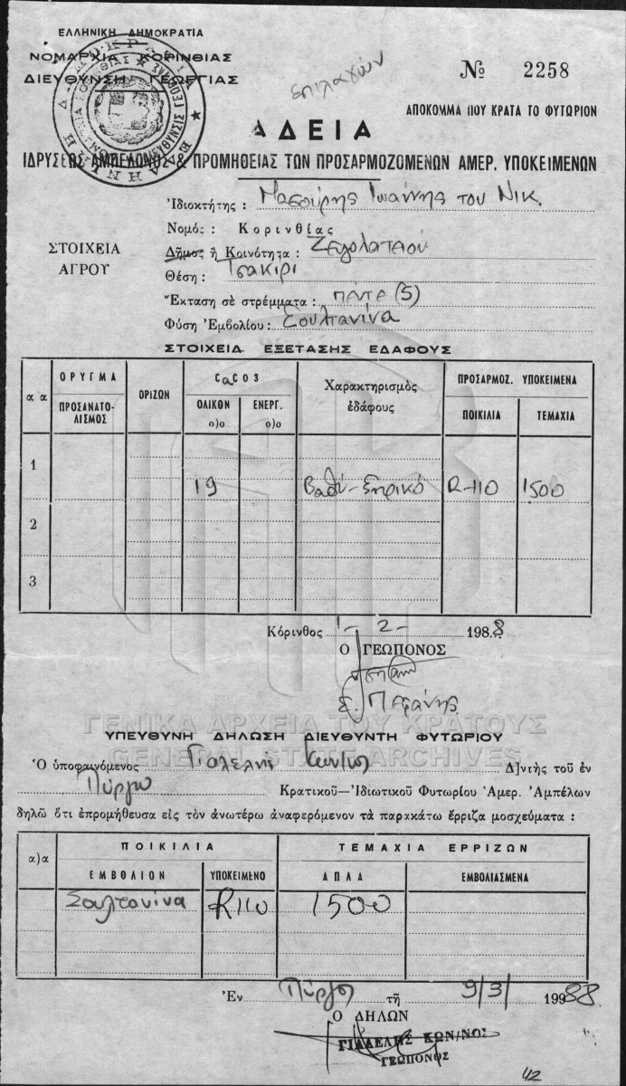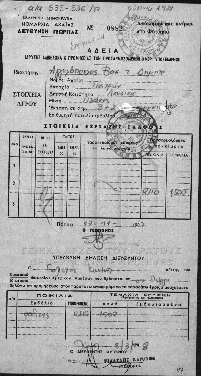 Contents: Αντίγραφα διαταγών κινήσεως γεωπόνων. Έρριζα. Έρριζα - άρριζα Λεβεντοχωρίου. Φυτώριο ΑΣΟ. Άδειες αναμπελώσεως. Φυτώρια. ...