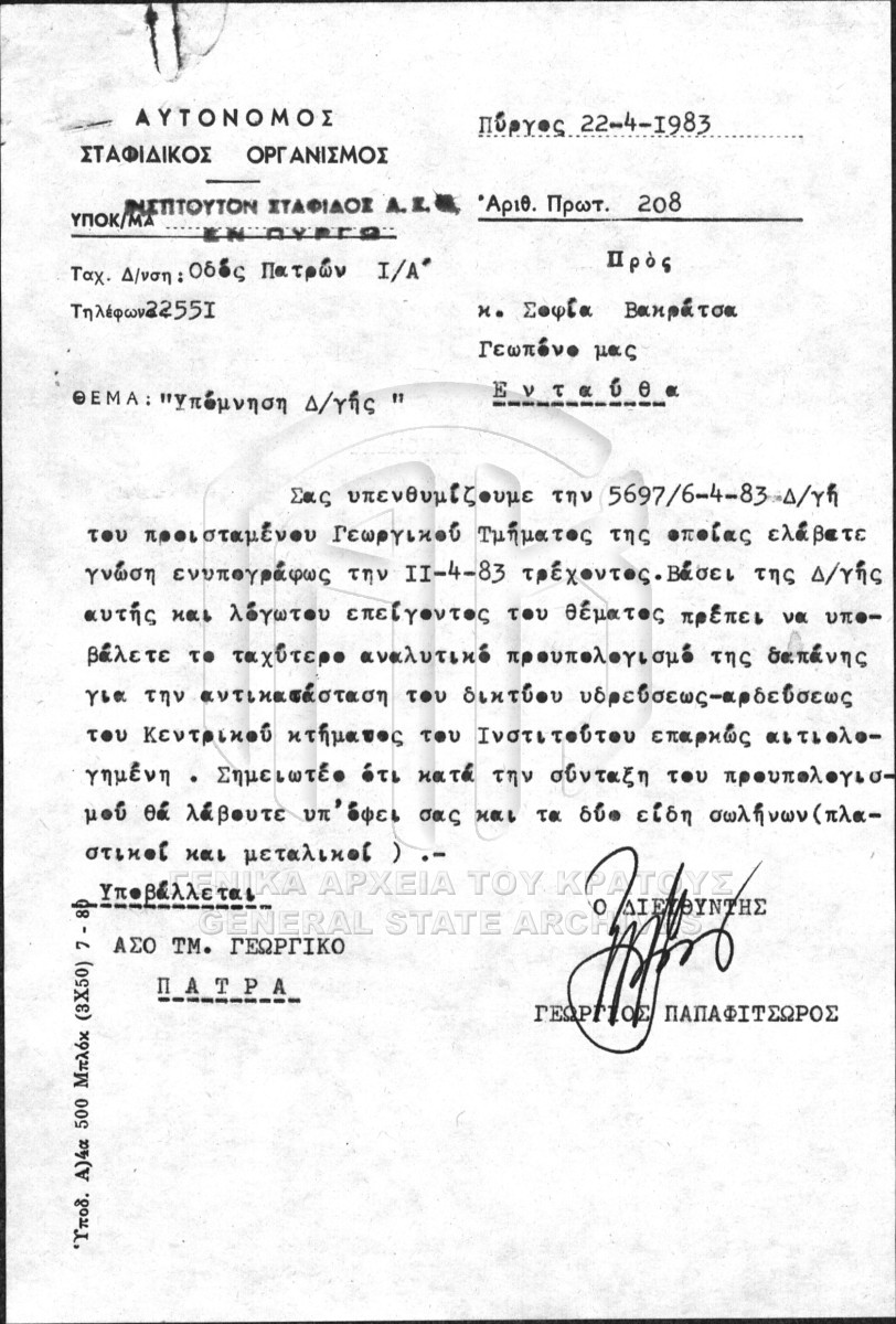 [Fonds] GRGSA-ILE_ADM007 ΙΝΣΤΙΤΟΥΤΟ ΣΤΑΦΙΔΑΣ / ΠΕΡΙΟΔΙΚΟ ΕΡΓΑ [1908 - 1992] Contenu: |