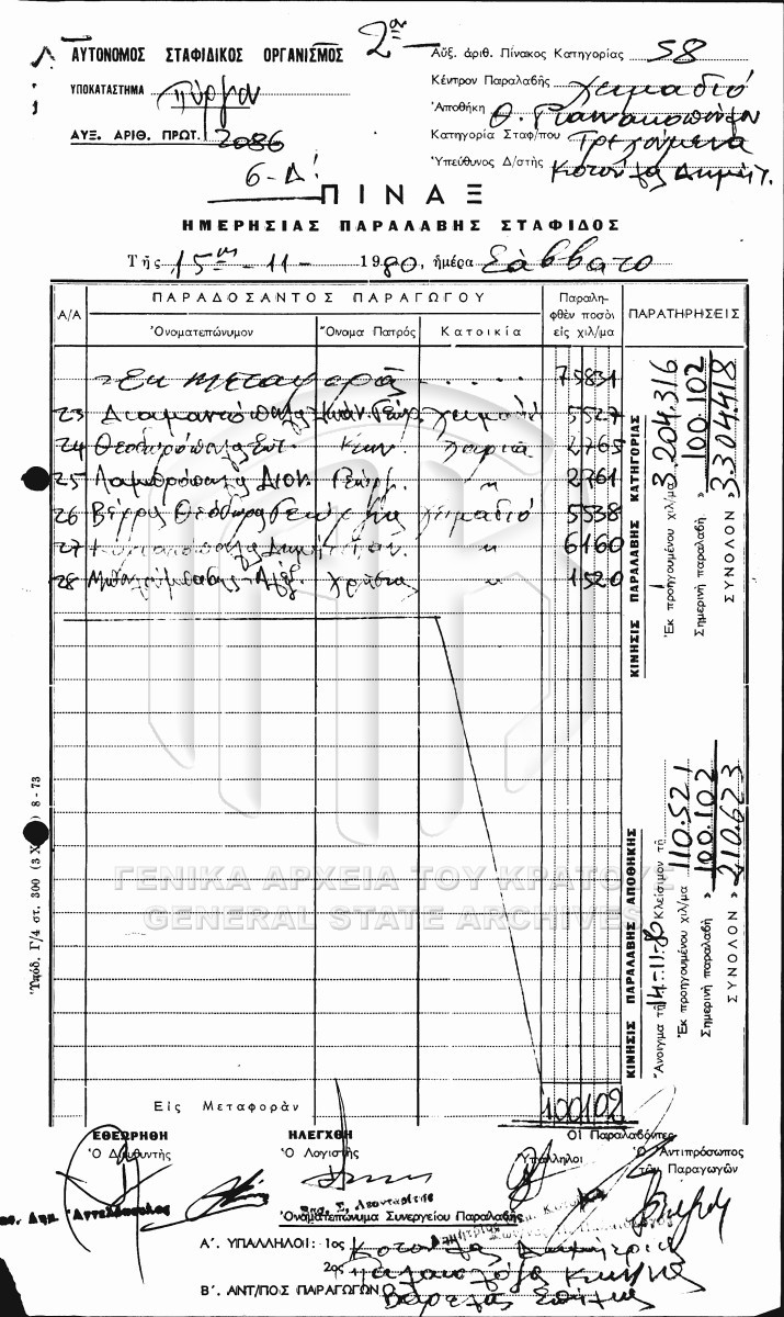 Πίνακες ημερήσιας παραλαβής σταφίδας.