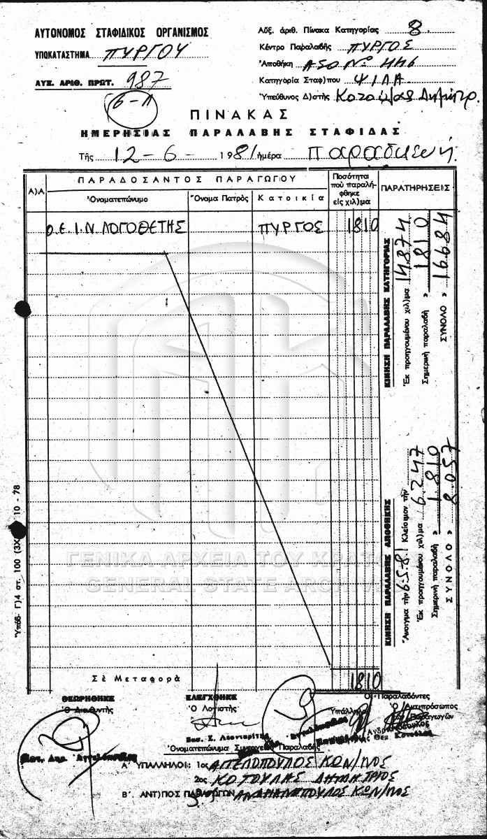 Πίνακες ημερήσιας παραλαβής σταφίδας.