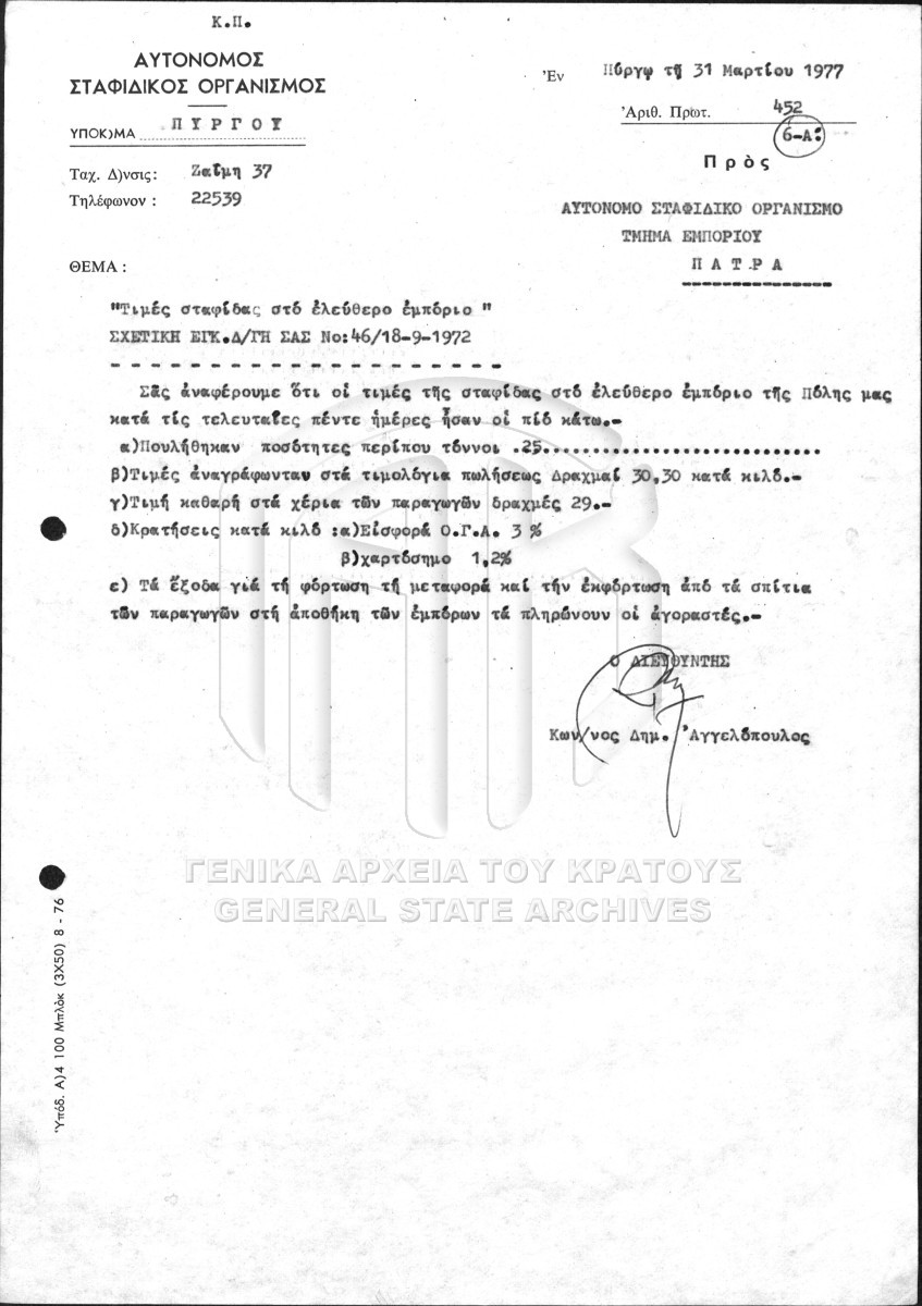 Περιεχόμενα: Αγοραπωλησία σταφίδας. Πίνακες ημερήσιας παραλαβής σταφίδας. Σχετικά με την παραγωγή σταφίδας. Σχετικά με την παραγωγή σ...